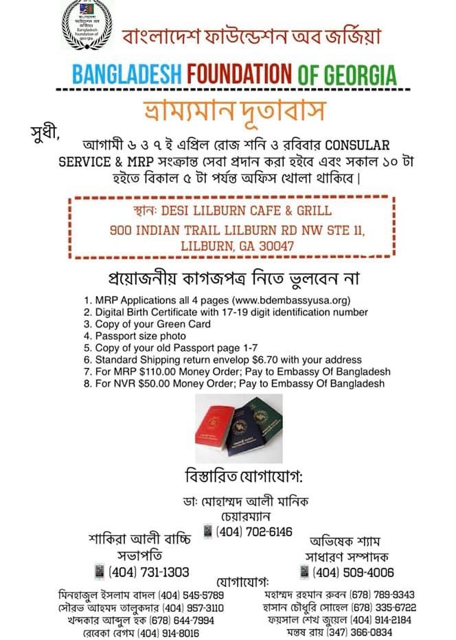 আটলান্টায় ভ্রাম্যমান দুতাবাস সেবা ৬ ও ৭ এপ্রিল