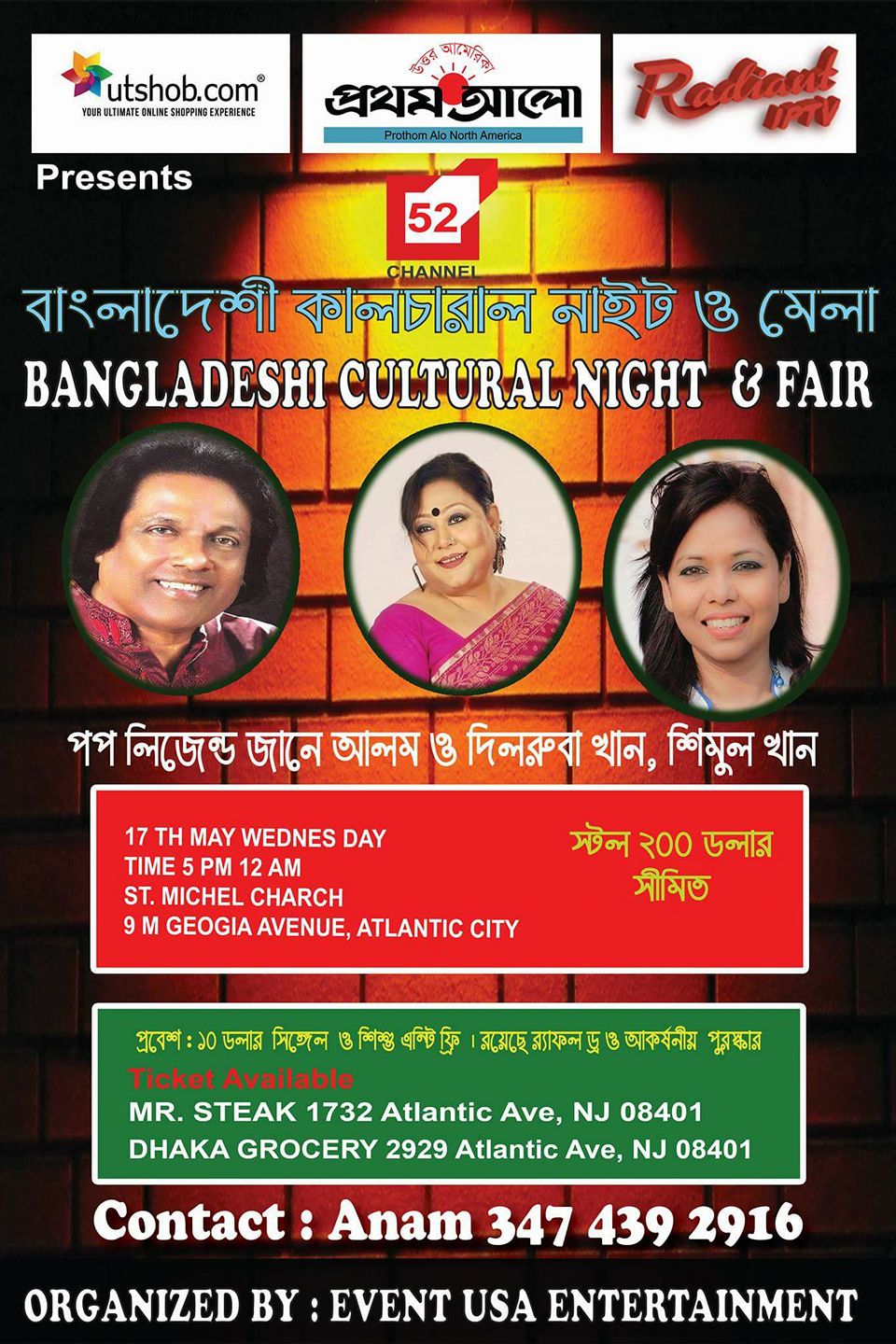 আটলান্টিক সিটি থেকে সুব্রত চৌধুরি- অাগামী ১৭ মে বুধবার নিউ জারসি অঙ্গরাজ্যের আটলান্টিক সিটিতে মনোজ্ঞ বাংলাদেশী কালচারাল নাইট ও মেলা অনুষ্ঠিত হবে।ঐদিন সন্ধ্যায় আটলান্টিক সিটির জর্জিয়া এভিনিউর সেন্ট মাইকেল গির্জার মিলনায়তনে ইভেন্ট ইউএসএ এন্টারটেইনমেণ্ট এর উদ্যোগে এই কালচারাল নাইটে সংগীত পরিবেশন করবেন বাংলাদেশে পপ সংগীতের অন্যতম কিংবদন্তী শিল্পী জানে আলম, জনপ্রিয় সংগীত শিল্পী দিলরুবা খান ও সংগীত শিল্পী শিমুল খান। এই অনুষ্ঠান স্পন্সর করবে উৎসব ডট কম, রেডিয়েণ্ট টিভি, প্রথম আলো। টিকেটের মূল্যমান দশ ডলার। টিকেট পাওয়া যাবে ঢাকা গ্রোসারি ও মিঃ ষ্টিক রেস্টুরেন্টে। অনুষ্ঠানে রেফল ড্রতে আকর্ষণীয় পুরস্কার দেওয়া হবে। বাংলাদেশী কালচারাল নাইট আয়োজনের সংবাদ কমিউনিটিতে বেশ সাড়া ফেলেছে।
