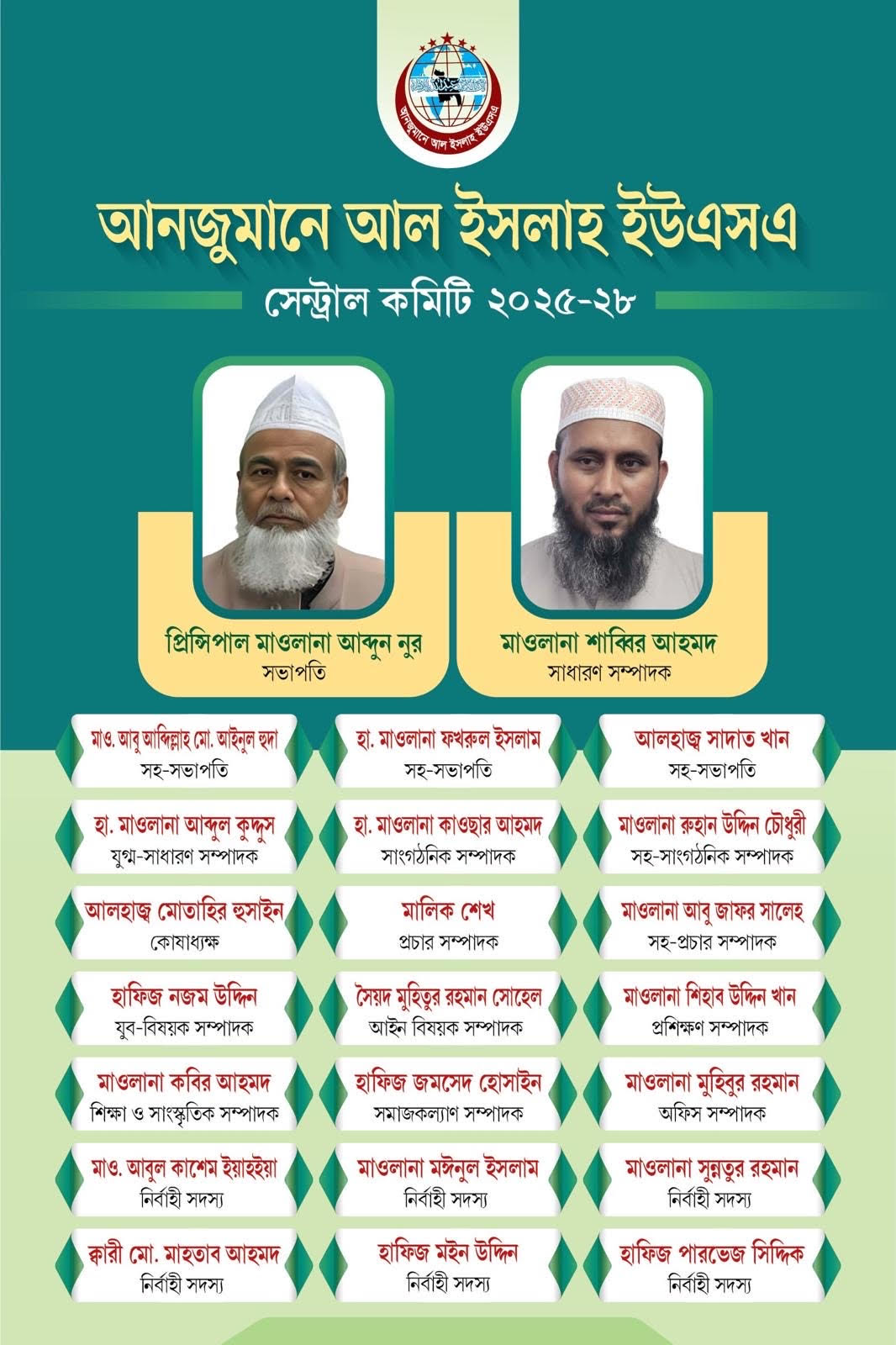 নবনির্বাচিত কমিটির অন্যান্য দায়িত্বশীলরা হলেন সহ-সভাপতি মাওলানা আবু আব্দিল্লাহ মোহাম্মদ আইনুল হুদা, হাফিজ মাওলানা ফখরুল ইসলাম, আলহাজ্ব সাদাত খান, যুগ্ম-সাধারণ সম্পাদক হাফিজ মাওলানা আব্দুল কুদ্দুস, সহ-সাংগঠনিক সম্পাদক মাওলানা রুহান উদ্দিন চৌধুরী, কোষাধ্যক্ষ আলহাজ্ব মোতাহির হুসাইন, প্রচার সম্পাদক মালিক শেখ, সহ-প্রচার সম্পাদক মাওলানা আবু জাফর মুহাম্মদ সালেহ, যুব-বিষয়ক সম্পাদক হাফিজ নজম উদ্দিন, আইন বিষয়ক সম্পাদক সৈয়দ মুহিতুর রহমান সোহেল, প্রশিক্ষণ সম্পাদক মাওলানা শিহাব উদ্দিন খান, শিক্ষা ও সাংস্কৃতিক সম্পাদক মাওলানা কবির আহমদ, সমাজকল্যাণ সম্পাদক হাফিজ জামশেদ হুসাইন এবং অফিস সম্পাদক মাওলানা মুহিবুর রহমান।