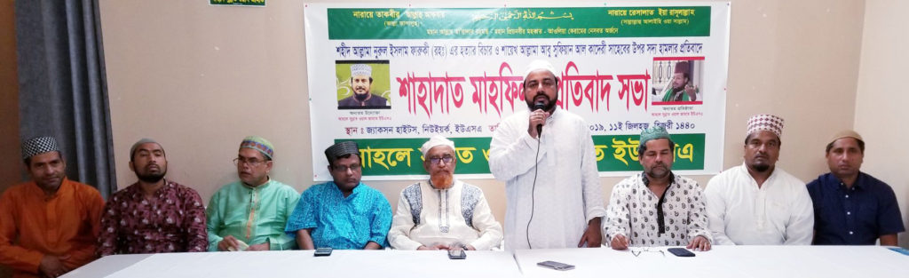 বক্তাগণ শহীদ আল্লামা নুরুল ইসলাম ফারুকীর ২০১৪ সালে ঢাকাস্থ নিজগৃহে দুস্কৃতিকারী উগ্রপন্থীদের হাতে নিহত হওয়ার ঘটনার বর্ণনা করে বলেন যে, বিগত পাঁচ বছরের সরকার -এ নির্মম হত্যাকা-ের কোন বিচার না করতে পারায় আহলে সুন্নাতপন্থী কোটি কোটি জনতা সরকারের উপর অসন্তুষ্ট। সাথে সাথে কোন হত্যার বিচার না হওয়া দেশ-রাষ্ট্রের মর্যাদার জন্যও হানিকর। বক্তাগণ আরও বলেন যে সদ্য গত ২রা আগষ্ট হাজীগঞ্জ চাঁদপুরে দুষ্কৃতিকারী কর্তৃক শায়েখ আল্লামা আাবু সুফিয়ান আল কাদেরীর উপর হামলার তীব্র প্রতিবাদ জানিয়ে সরকারের কাছে তড়ীৎ বিচারের দাবী জানান। বক্তাগণ দেশে আলেমদের নিরাপত্তার জন্য প্রয়োজনে বিশেষ সরকারী ব্যবস্থা গ্রহণেরও দাবী জানান। উল্লেখ্য যে ২০১৪ সালে শহীদ আল্লামা নুরুল ইসলাম ফারুকী ও আল্লামা আবু সুফিয়ান আল্ কাদেরী ধর্মীয় সফরে আমেরিকায় এলে তাঁরা সর্বপ্রথম আহলে সুন্নাত ওয়াল জামাত ইউএসএ গঠনের প্রচেষ্টা করেন। আর তাই অত্র সংগঠন গভীরভাবে শহীদ আল্লামা নুরুল ইসলাম ফারুকী ও আবু সুফিয়ান আল কাদেরীর কাছে ঋণী। অত্র সংগঠন সর্বদা সংগঠনের অন্যতম উদ্যোক্তা শহীদ আল্লামা নুরুল ইসলাম ফারকী (রহঃ) ও সংগঠনের অন্যতম প্রতিষ্ঠাতা শায়েখ আল্লামা আবু সুফিয়ান আল কাদেরীর অবদানকে স্মরণ রাখার সংকল্প করেন। জিকির, সালাতু সালাম, কিয়াম, খতমে গাউসিয়া, শাজারায়ে কাদেরিয়া আলিয়া পাঠান্তে বিশেষ মুনাজাতের মাধ্যমে শাহাদত মাহফিল ও প্রতিবাদ সভা সমাপ্ত হয়।