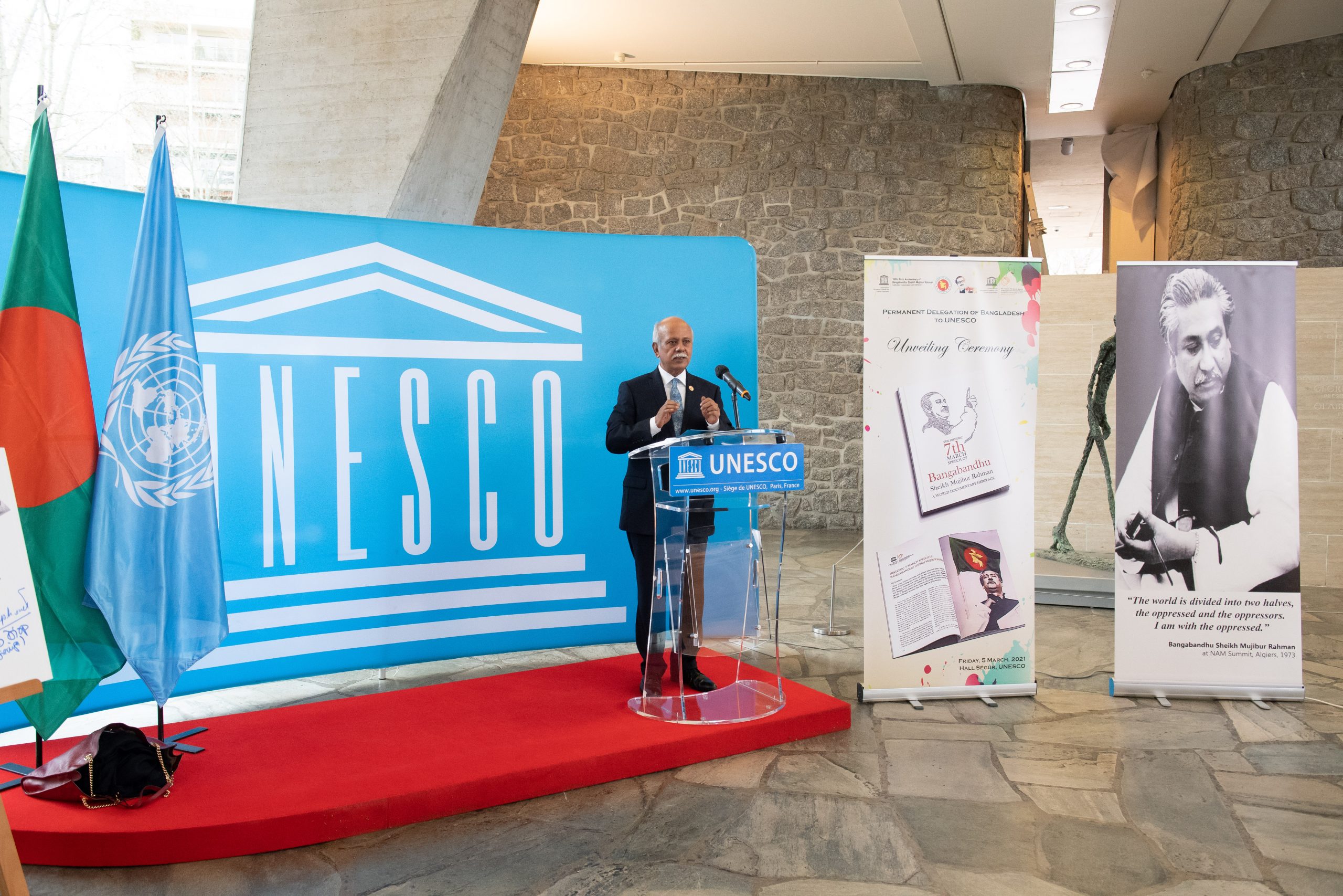 উল্লেখ্য, ২০১৭ সালে এ ঐতিহাসিক ভাষণ ইউনেস্কো এর মেমোরি অব দ্য ওয়ার্ল্ড রেজিস্টারে বিশ্ব প্রামাণ্য ঐতিহ্য হিসেবে অন্তর্ভুক্ত হয়। এই প্রথম বঙ্গবন্ধুর ঐতিহাসিক ৭ মার্চের ভাষণ জাতিসংঘের সকল দাপ্তরিক ভাষায় অনুদিত হল। ইউনেস্কো সদর দপ্তরে কোভিড পরিস্থিতি বিবেচনায় শুধুমাত্র আমন্ত্রিত অতিথিদের উপস্থিতিতে গ্রন্থটির মোড়ক উন্মোচন করা হয় এবং দূতাবাসের সামাজিক যোগাযোগ মাধ্যমে অনুষ্ঠানটি সরাসরি সম্প্রচার করা হয়।