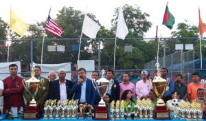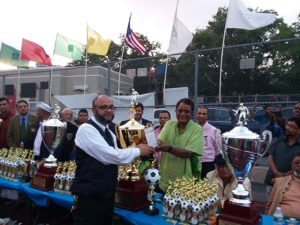 রোববারের খেলা শেষে এবারের ‘এক্সিট কার এন্ড লিমো সার্ভিস এবং অ্যাপোলো ব্রোকারেজ’ ফুটবল লীগ ও টুর্নামেন্টের রানার্স আপ এবং চ্যাম্পিয়ন দলের মাঝে পুরষ্কার বিতরণ করা হয়। এদিন অপরাহ্নে ফুটবল র্টুনামেন্টের ফাইনাল খেলার উদ্বোধন করেন প্রধান অতিথি জাতিসংঘে নিযুক্ত বাংলাদেশের স্থায়ী প্রতিনিধি ও রাষ্ট্রদূত মাসুদ বিন মোমেন এবং বিশেষ অতিথি নিউইয়র্কে বাংলাদেশের কনসাল জেনারেল সাদিয়া ফয়জুননেসা। স্পোর্টস কাউন্সিলের সভাপতি মহিউদ্দিন দেওয়ানের সভাপতিত্বে আয়োজিত এই পর্বে লীগ ও টুর্নামেন্টের প্রধান পৃষ্ঠপোষক শমশের আলী, স্পোর্টস কাউন্সিলের প্রতিষ্ঠাতা সভাপতি মনজুর আহমেদ চৌধুরী, প্রতিষ্ঠাতা সাধারণ সম্পাদক ও উপদেষ্টা আব্দুর রহীম বাদশা, উপদেষ্টা ছদরুন নূর, শামসুল আবেদীন, ডা. এনামুল হক, আতাউর রহমান সেলিম, আব্দুর নূর বড় ভুইয়া ও আব্দুল হাসিম হাসনু এবং বাংলাদেশ সোসাইটি ইনক’র আসন্ন নির্বাচনে প্রতিদ্বন্দ্বিতাকারী ‘নয়ন-আলী’ প্যানেলের সভাপতি পদপ্রার্থী কাজী আশরাফ হোসেন নয়ন সংক্ষিপ্ত শুভেচ্ছা বক্তব্য রাখেন। এই পর্ব উপস্থাপনায় ছিলেন সংগঠনের সাধারণ সম্পাদক জুয়েল আহমেদ।