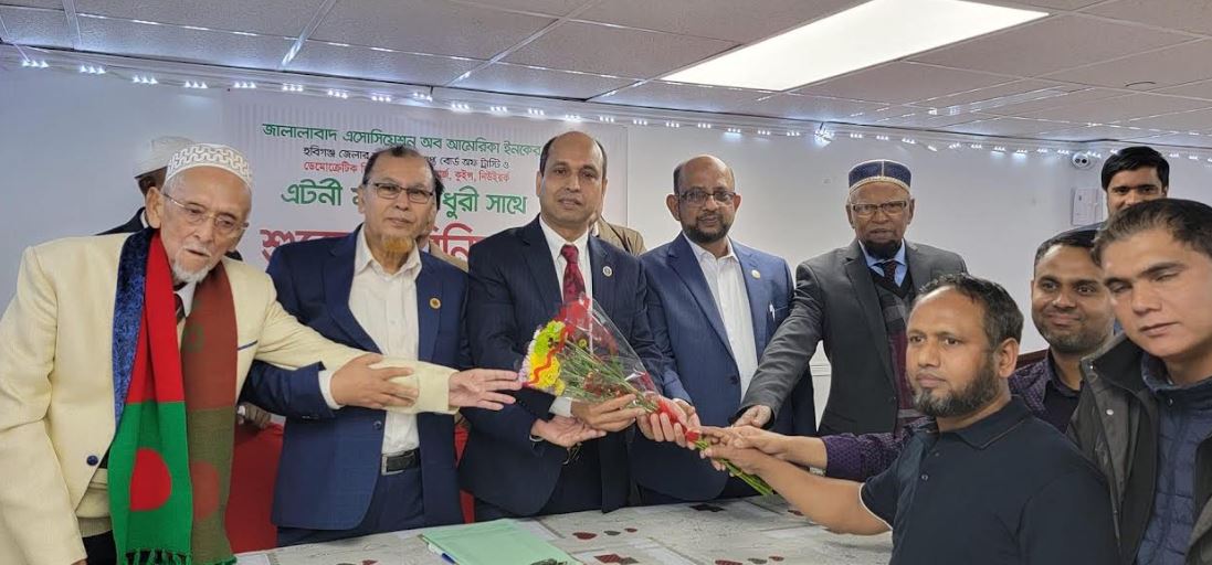 জালালাবাদ এসোসিয়েশন অফ আমেরিকার বোর্ড অফ ট্রাস্টি এটর্নী মঈন চৌধুরী ফুলেল শুভেচ্ছায় সিক্ত