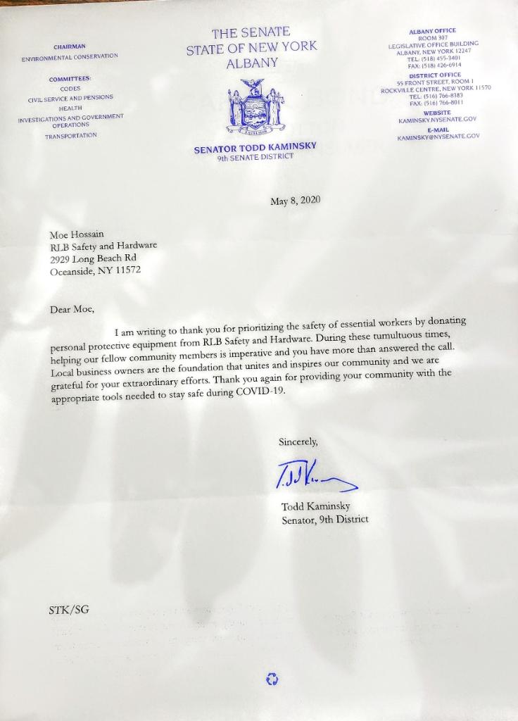 জানা যায়, ‘আরএলবি গ্রুপ অব কর্পোরেশন’র কর্ণধার আকতার হোসেন বাদলের মালিকানাধীন ‘আরএলবি সেইফটি অ্যান্ড হার্ডওয়্যার স্টোর’ লং আইল্যান্ডের ওসেনসাইড এবং লিনব্রুকে করোনাকালে সপ্তাহের ৭দিনই সকাল-সন্ধ্যা খোলা রাখছে। দুটি স্টোরেই ন্যাশনাল সেইফটি স্ট্যান্ডার্ড অনুযায়ী পণ্য আমদানি ও বিক্রি হচ্ছে। বাংলাদেশী মালিকানাধীন এই স্টোর দুটিতে মাস্ক, সেনিটাইজার, গ্লাভস এবং চিকিৎসক-নার্স-পুলিশ-ফায়ার সার্ভিস-ইলেকট্রিসিয়ান-ইমার্জেন্সি মেডিক্যাল টেকনিশিয়ান ছাড়াও কন্সট্রাকশন কাজের সময়ে বিশেষভাবে জরুরী বুট, শার্ট, ব্লেজার, ক্যাপ ইতাদি হ্রাসকৃত মূল্যে বিক্রির মধ্যদিয়ে জনসাধারণকে করোনা থেকে সুরক্ষায় অপরিসীম ভূমিকা পালন করছে। এ সেবা প্রদানের মধ্যদিয়ে এলাকাবাসীর প্রশংসা কুড়ায় স্টোর দুটি। বিষয়টি নজর এড়ায়নি নিউইয়র্ক স্টেট সিনেট ডিস্ট্রিক্ট ৯-এর সিনেটর টোড কামেনস্কাইরও।