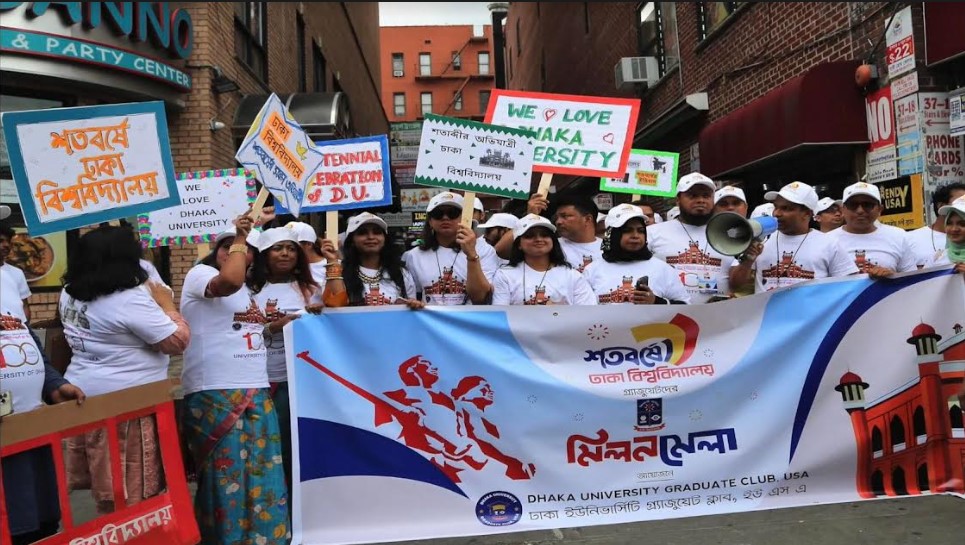 ইউএসএনিউজঅনলাইন.কম ডেস্ক: ঢাকা বিশ্ববিদ্যালয় গ্রাজুয়েট ক্লাব ইউএসএ-এর উদ্যোগে ঢাকা বিশ্ববিদ্যালয়ের শতবর্ষ পূর্তি উদযাপিত হয়েছে। গত ৪ সেপ্টেম্বর সাড়ম্বরভাবে নিউইয়র্কের উডসাইডের গুলশান টেরেসে এই আয়োজন সম্পন্ন হয়। দুই পর্বে সম্পন্ন হয় অনুষ্ঠানটি। প্রথম পর্বে ছিল উদ্বোধনী অনুষ্ঠান ও র্যালি। দ্বিতীয় পর্বে কেক কাটা, আলোচনা ও বিভিন্ন প্রকার সাংস্কৃতিক অনুষ্ঠান। যুক্তরাষ্ট্রে বসবাসরত ঢাকা বিশ্ববিদ্যালয়ের সাবেক শিক্ষার্থীরা এদিন দুপুরের পর থেকেই জড়ো হতে থাকেন নিউইয়র্কের প্রাণকেন্দ্র জ্যাকসন হাইটসে। টি-শার্ট বিতরণের পর শুরু হয় র্যালি। বিকেল সাড়ে ৪টার দিকে৩৭-৭৩ এভিনিউতে অবস্থিত বাংলাদেশ প্লাজার সামনে থেকে র্যালি শুরু হয়। এটি পরিচালনা করেন মুহাম্মদ শহীদুল্লাহ। ঢাকা বিশ্ববিদ্যালয়ের সাবেক শিক্ষার্থীরা বাঁশি, ঢোল-তবলা বাজিয়ে, গান গেয়ে র্যালিকে আরওআনন্দঘন করে তোলেন। বাংলাদেশের জাতীয় সংগীত ও যুক্তরাষ্ট্রের ন্যাশনাল এনথেম গাওয়ার মধ্য দিয়ে শুরু হয় অনুষ্ঠান। শুরুতে কোরআনুল কারিম থেকে তেলাওয়াত করেন মুহাম্মদ শহীদুল্লাহ। এরপর একটি তথ্যচিত্র প্রদর্শন করা হয়।