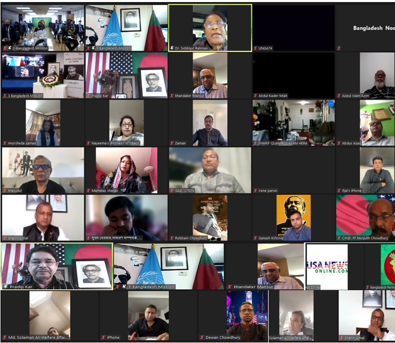 ইউএসএনিউজঅনলাইন.কম : জাতিসংঘে বাংলাদেশ স্থায়ী মিশনে ১৫ আগস্ট যথাযোগ্য মর্যাদায় ও অত্যন্ত ভাবগম্ভীর পরিবেশে সর্বকালের সর্বশ্রেষ্ঠ বাঙালি জাতির পিতা বঙ্গবন্ধু শেখ মুজিবুর রহমানের শাহাদাৎ বার্ষিকী এবং জাতীয় শোক দিবস পালন করা হয়। মিশনের বঙ্গবন্ধু মিলনায়তনে স্থানীয় সময় সকাল ১১ টায় আয়োজন করা হয় জাতীয় শোক দিবসের এ অনুষ্ঠান। কোভিড-১৯ এর প্রেক্ষাপটে মিশন আয়োজিত এই অনুষ্ঠানটি সরাসরি ও ভার্চুয়াল অংশগ্রহণের মাধ্যমে মিশ্র উপায়ে অনুষ্ঠিত হয়। এতে যুক্তরাষ্ট্র আওয়ামী লীগ ও এর সহযোগী সংগঠন, বঙ্গবন্ধু পরিষদ, বঙ্গবন্ধু ফাউন্ডেশন, শেখ হাসিনা মঞ্চের নেতৃবৃন্দ এবং যুক্তরাষ্ট্রে বসবাসরত বীর মুক্তিযোদ্ধাগণসহ বিপুল সংখ্যক প্রবাসী বাংলাদেশিগণ ভার্চুয়ালভাবে অংশগ্রহণ করেন। মিশনের বঙ্গবন্ধু মিলনায়তনে আয়োজিত জাতির পিতার ৪৬তম শাহাদাৎ বার্ষিকী এবং জাতীয় শোক দিবস পালনের এই কর্মসূচি জাতীয় পতাকা অর্ধনমিত রাখা ও জাতীয় সঙ্গীত পরিবেশনের মাধ্যমে শুরু করা হয়। এর পর জাতির পিতা, বঙ্গমাতা এবং তাঁদের শহীদ পরিবারবর্গসহ ১৫ আগস্টের সকল শহীদদের বিদেহী আত্মার প্রতি শ্রদ্ধা জানিয়ে দাঁড়িয়ে একমিনিট নিরবতা পালন করা হয়। অত:পর ১৫ আগস্টের শহীদদের আত্মার মাগফিরাত কামনা করে মোনাজাত করা হয়।