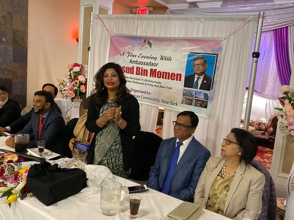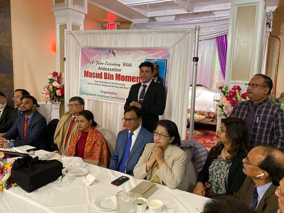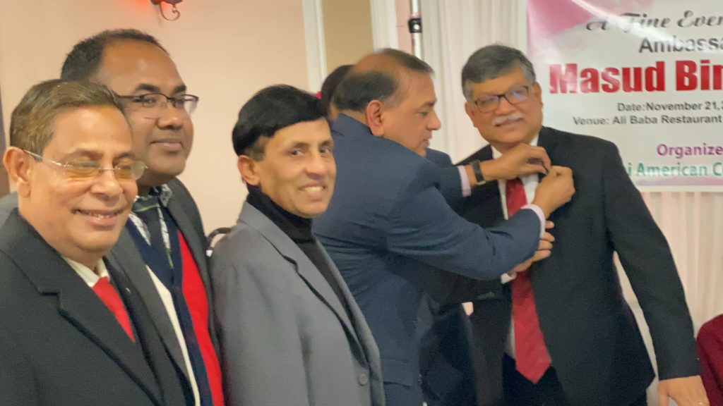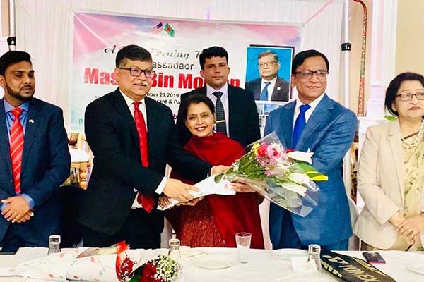 তবে তার আগে ২১ নভেম্বর বৃহস্পতিবার রাতে বিদায়ী রাষ্ট্রদূত মাসুদ বিন মোমেনকে গণসংবর্ধনা দেওয়া হয়। কুইন্সে ‘আলী বাবা’ রেস্টুরেন্টের মিলনায়তনে ‘বাংলাদেশী আমেরিকান কমিউনিটি’র ব্যানারে এক সমাবেশে রাষ্ট্রদূত মাসুদকে ফুলেল শুভেচ্ছার পাশাপাশি তার প্রিয় ব্যাডমিন্টনের সবচেয়ে দামী একটি র্যাকেট উপহার দেন পিপল এন টেকের সিইও ইঞ্জিনিয়ার আবু হানিপ। আয়োজকদের পক্ষ থেকে রাষ্ট্রদূত মাসুদের স্ত্রী সোমা ফাহমিদাকে উত্তরীয় পড়িয়ে দেয়া হয়। প্রবাসীরা শ্রদ্ধাঞ্জলি আর ভালোবাসার প্রকাশ হিসেবে এই কূটনীতিক দম্পতির উত্তরোত্তর সমৃদ্ধি কামনাও করেন।