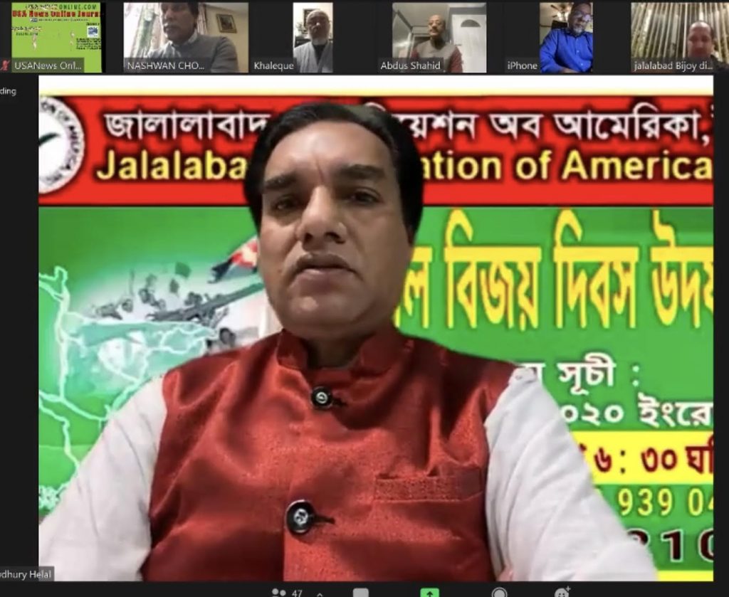 ইউএসএনিউজঅনলাইন.কম : জালালাবাদ এসোসিয়েশন অব আমেরিকার উদ্যোগে ভার্চুয়েল মাধ্যমে বিজয় দিবস উদযাপিত হয়। সংগঠনের সভাপতি ময়নুল হক চৌধুরী হেলালের সভাপতিত্বে ও সাধারণ সম্পাদক মিজানুর রহমান চৌধুরী শেফাজের উপস্থাপনায় বাংলাদেশ ও আমিরিকার জাতীয় সঙ্গীতের মধ্যদিয়ে অনুষ্ঠান শুরু হয়।