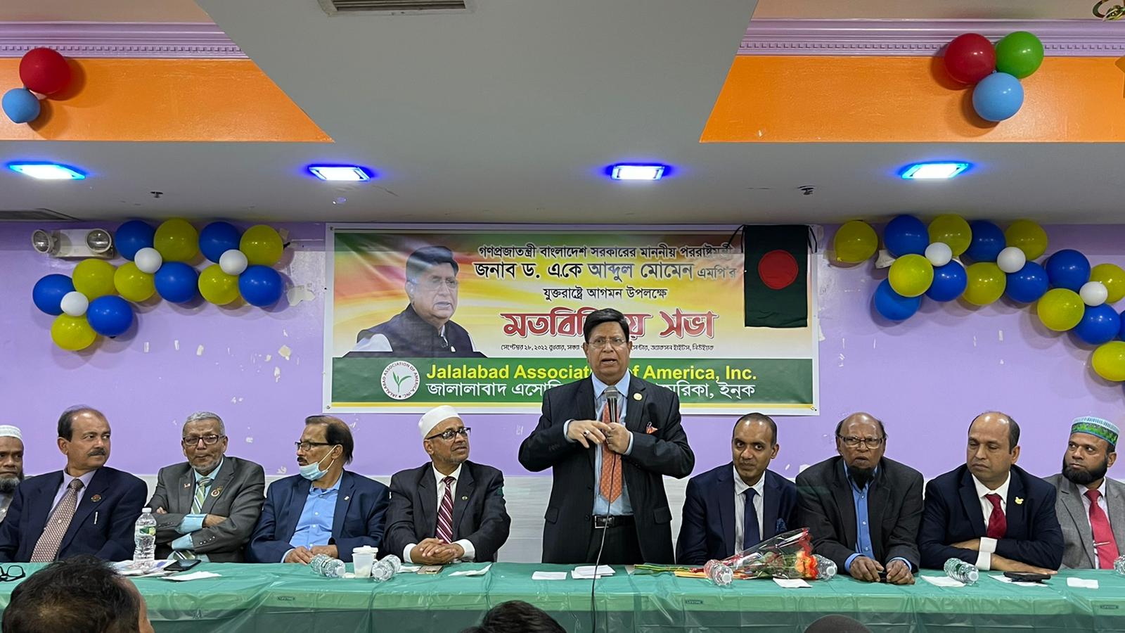 জ্যাকসন হাইটসের নবান্ন পার্টি হলে বুধবার (২৮ সেপ্টেম্বর) সন্ধ্যায় আয়োজিত সভায় সভাপতিত্ব করেন জালালাবাদ এসোসিয়েশন অব আমেরিকার সভাপতি বদরুল হোসেন খান। সভা পরিচালনা করেন সংগঠনের সাধারণ সম্পাদক মইনুল ইসলাম। নিউইয়র্কে বাংলাদেশে কনসাল জেনারেল ড. মনিরুল ইসলাম ছাড়াও সভায় আমন্ত্রিত অতিথি হিসেবে সভামঞ্চে উপবিষ্ট ছিলেন প্রবীণ সাংবাদিক সৈয়দ মোহাম্মদ উল্লাহ, বাংলাদেশ সোসাইটি ও জালালাবাদ এসোসিয়েশনের সাবেক সভাপতি আজমল হোসেন কুনু, সোসাইটির সাধারণ সম্পাদক রুহুল আমীন সিদ্দিকী, বিশিষ্ট রাজনীতিক এম এ সালাম ও দেওয়ান শাহেদ চৌধুরী, বাংলাদেশ সোসাইটির সাবেক সাধারণ সম্পাদক ও সিলেট সদর সমিতি ইউএসএ’র সভাপতি অধ্যাপিকা রানা ফেরদৌস চৌধুরী, বীর মুক্তিযোদ্ধা তোফায়েল আহমেদ চৌধুরী ও মুজাহিদুল ইসলাম, কুইন্স ডেমোক্র্যাটিক পার্টির ডিষ্ট্রিক্ট লীডার এট লার্জ এটর্নী মঈন চৌধুরী, এডভোকেট মোহাম্মদ নাসির উদ্দিন। অনুষ্ঠানে বিভিন্ন সংগঠনের পক্ষ থেকে পররাষ্ট্রমন্ত্রীকে ফুলের তোড়া দিয়ে শুভেচ্ছা জানানো হয়।