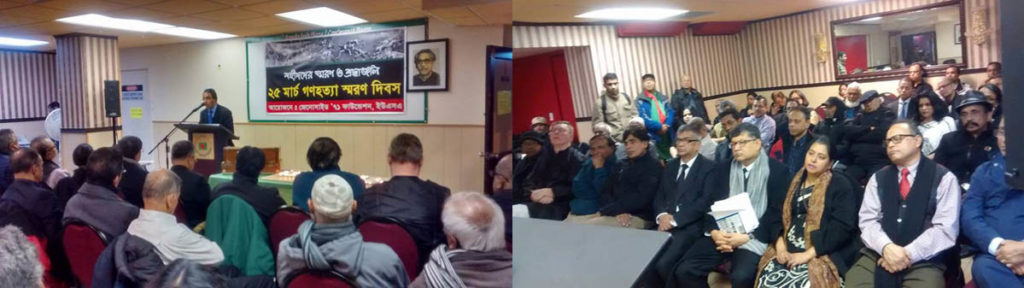 নিউইয়র্ক : জেনোসাইড ’৭১ ফাউন্ডেশন, ইউএসএ ২৫ মার্চ শনিবার সন্ধ্যায় নিউইয়র্ক এর জ্যাকসন হাইস্টস্ বাংলাদেশ প্লাজা মিলনায়তনে বিভিন্ন কর্মসূচীর মধ্য দিয়ে পালন করলো “গণহত্যা দিবস (জেনোসাইড স্মরণ দিবস)”। অনুষ্ঠানে প্রধান অতিথী ছিলেন জাতিসংঘে নিযুক্ত বাংলাদেশ মিশনের স্থায়ী প্রতিনিধি ও রাস্টদূত মাসুদ-বিন-মোমেন। বিশেষ অতিথী ছিলেন বাংলাদেশ সরকারের কনস্যাল জেনারেল, নিউইয়র্ক মোঃ শামীম আহসান। সভাপতিত্ব করেন জেনোসাইড ’৭১ ফাউন্ডেশন, ইউএসএর সভাপতি ড. প্রদীপ রঞ্জন কর এবং সঞ্চালনায় ছিলেন কবি ও আবৃত্তিকার গোপন সাহা। সেমিনার ও আলোচনায় মূল প্রবন্ধ উপস্থাপন করেন নিউইয়র্ক থেকে প্রকাশিক সাপ্তাহিক বাঙালী সম্পাদক ও সাহিত্য সমালোচক কৌশিক আহমেদ। তিনি বাংলাদেশের গণহত্যার উপর তথ্যবহুল প্রবন্ধ উপস্থাপন করেন। অনুষ্ঠানে গণহত্যায় শহীদের স্মরণে মোমের আলো প্রজ্জ্বলন করা হয় এবং ২৬ মার্চ মহান স্বাধীনতা দিবসের প্রথম প্রহরে বঙ্গবন্ধুর প্রতিকৃতিতে পুষ্পার্ঘ্য অর্পণ করা হয় ও সম্মিলিত কণ্ঠে জাতীয় সংঙ্গীত পরিববেশিত হয়।