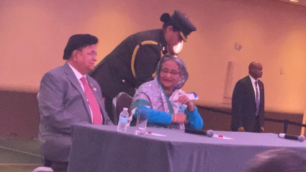 এ সময় মঞ্চে উপস্থিত ছিলেন পররাষ্ট্রমন্ত্রী ড. এ কে আব্দুল মোমেন। জাতিসংঘে বাংলাদেশের স্থায়ী প্রতিনিধি রাষ্ট্রদূত মাসুদ বিন মোমেন স্বাগত বক্তৃতা ও অনুষ্ঠান সঞ্চালনা করেন। যুক্তরাষ্ট্র আওয়ামীলীগের আয়োজনে এ সংবর্ধনা অনুষ্ঠিত হলেও সীমাহীন দলীয় কোন্দলের কারণে দলের কাউকে বক্তব্য রাখতে দেয়া হয়নি। এমনকি যুক্তরাষ্ট্র আওয়ামীলীগের কাউকে মঞ্চে পর্যন্ত দেখা যায়নি।
