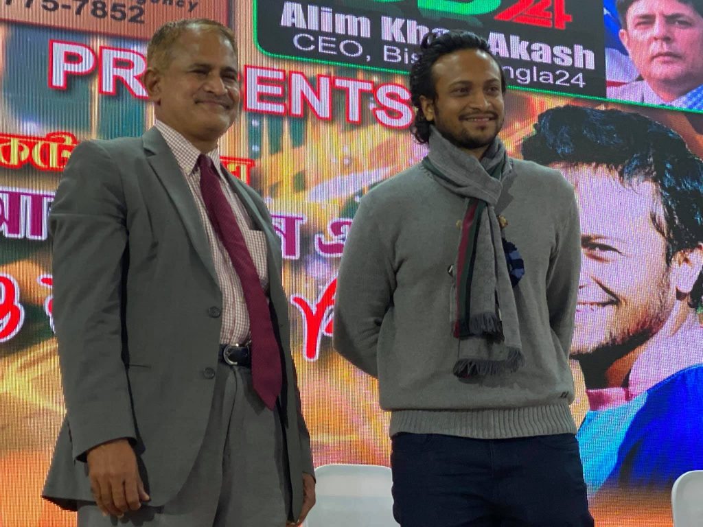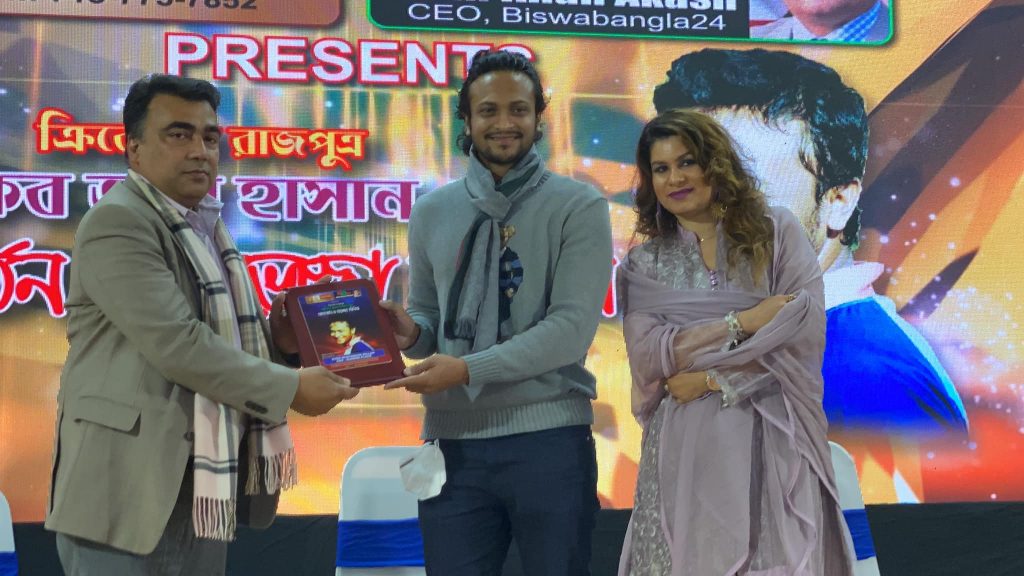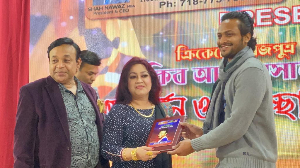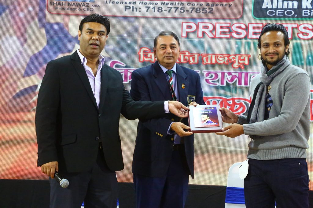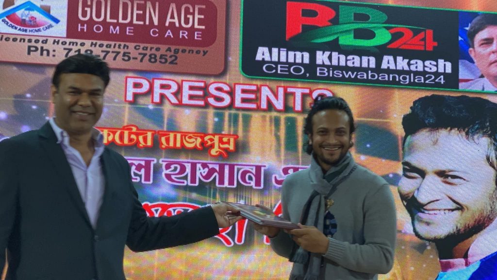 গোল্ডেন এইজ হোম কেয়ার ও বিশ্ববাংলা টোয়েন্টিফোর টিভির সহায়তায় এ অনুষ্ঠানে নিউইয়র্কসহ উত্তর আমেরিকায় বসবাসরত বাংলাদেশের সাবেক জাতীয় এবং আন্তর্জাতিক খেলোয়াড় ও ক্রীড়া সংগঠকদের পক্ষ থেকে বাংলাদেশ ক্রীড়া সংস্থা আমেরিকা ইনক’র প্রধান সমন্বয়কারী আব্দুর রহিম বাদশা ফুল দিয়ে বরণ করে নেন বিশ্ব ক্রিকেটের বরপুত্র সাকিবকে।