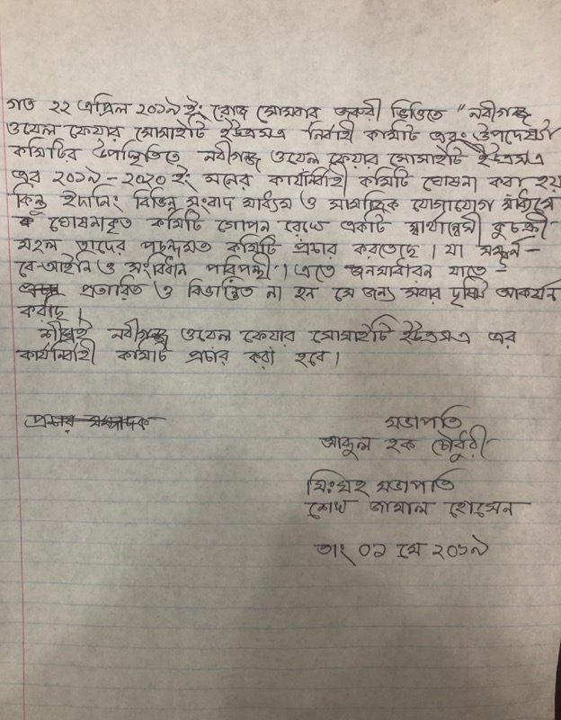 বিদায়ী কমিটির সভাপতি আবদুল হক চৌধুরী এবং সিনিয়ার সহ সভাপতি জামাল হুসেন বিবৃতিতে উল্লেখ করেন, গত ২২ এপ্রিল সোমবার নবীগঞ্জ থানা কল্যাণ সোসাইটি ইউএসএ ইনকের কার্যকরী কমিটি এবং নির্বাচন কমিশন ঘোষিত নব নির্বাচিত কমিটির উপস্থিতিতে ২০১৯-২০২০ সালের জন্য সমঝোতার ভিত্তিতে একটি কমিটি চূড়ান্ত করা হয়। কিন্তু একটি স্বার্থন্বেষী মহল সমঝোতার ভিত্তিতে গঠিত চূড়ান্ত কমিটি পাশ কাটিয়ে গঠনতন্ত্র পরিপন্থি ও বেআইনীভাবে তাদের মনগড়া একটি কমিটির নাম প্রচার করেছে। বিবৃতিতে প্রবাসী নবীগঞ্জবাসীকে বিভ্রান্ত না হওয়া অনুরোধ জানিয়ে বলে হয়েছে শিগগির নবীগঞ্জ থানা কল্যাণ সোসাইটি ইউএসএ’র নতুন কমিটির নাম প্রচার করা হবে।