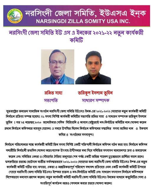 নরসিংদী জেলা সমিতি ইউএসএর নতুন কমিটি : রঞ্জিত সভাপতি, তুহিন সাধারণ সম্পাদক