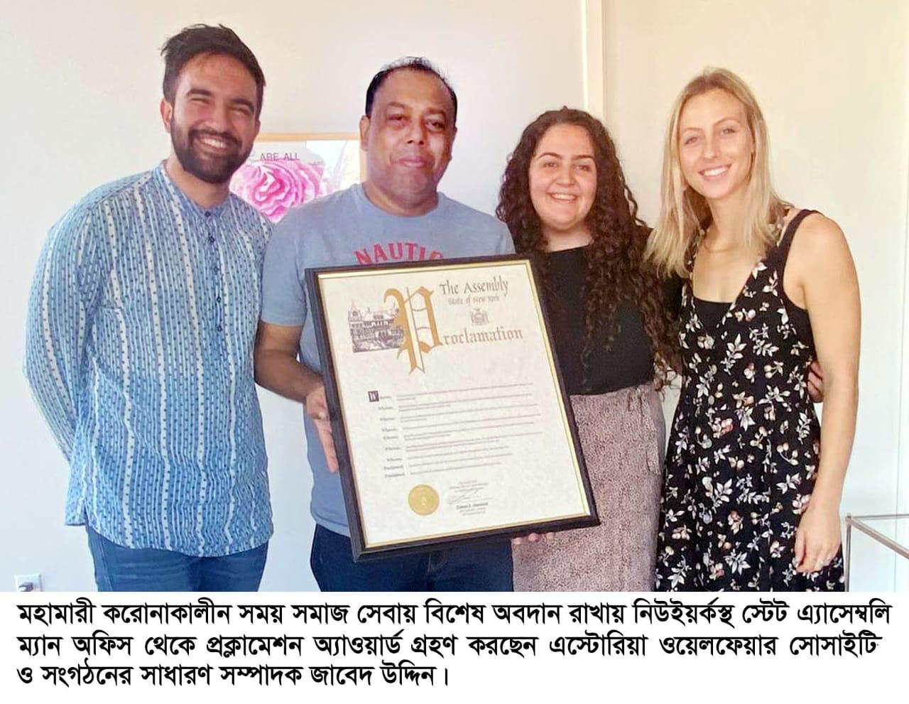 নিউইয়র্কে এস্টোরিয়া ওয়েলফেয়ার সোসাইটির সাধারণ সম্পাদক জাবেদ উদ্দিনের স্টেট এসেম্বলি প্রক্লামেশন লাভ