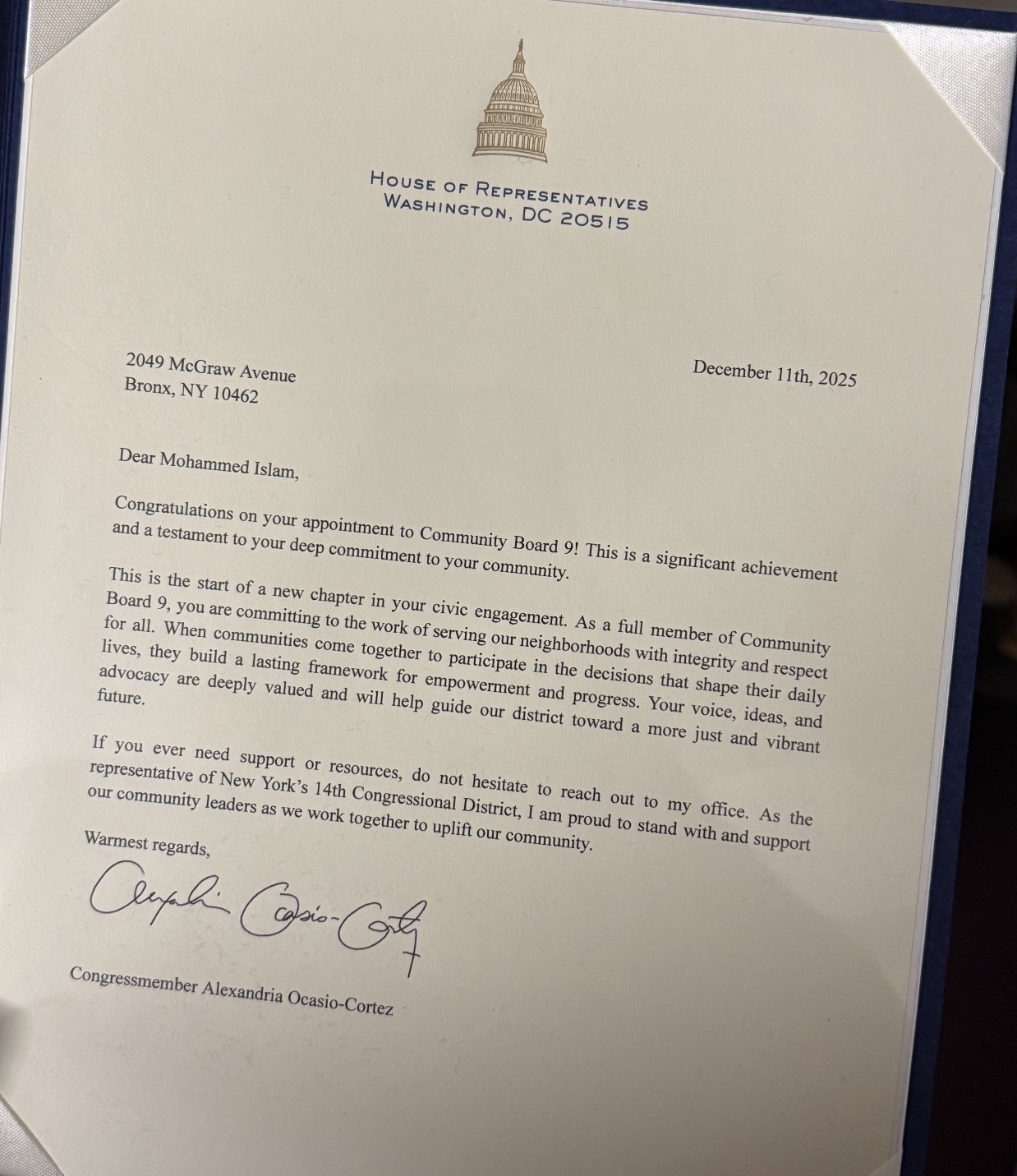 নিউইয়র্কে ব্রঙ্কস কমিউনিটি বোর্ড ৯ এর মেম্বার এ ইসলাম মামুন কংগ্রেসনাল সাইটেশন পেলেন