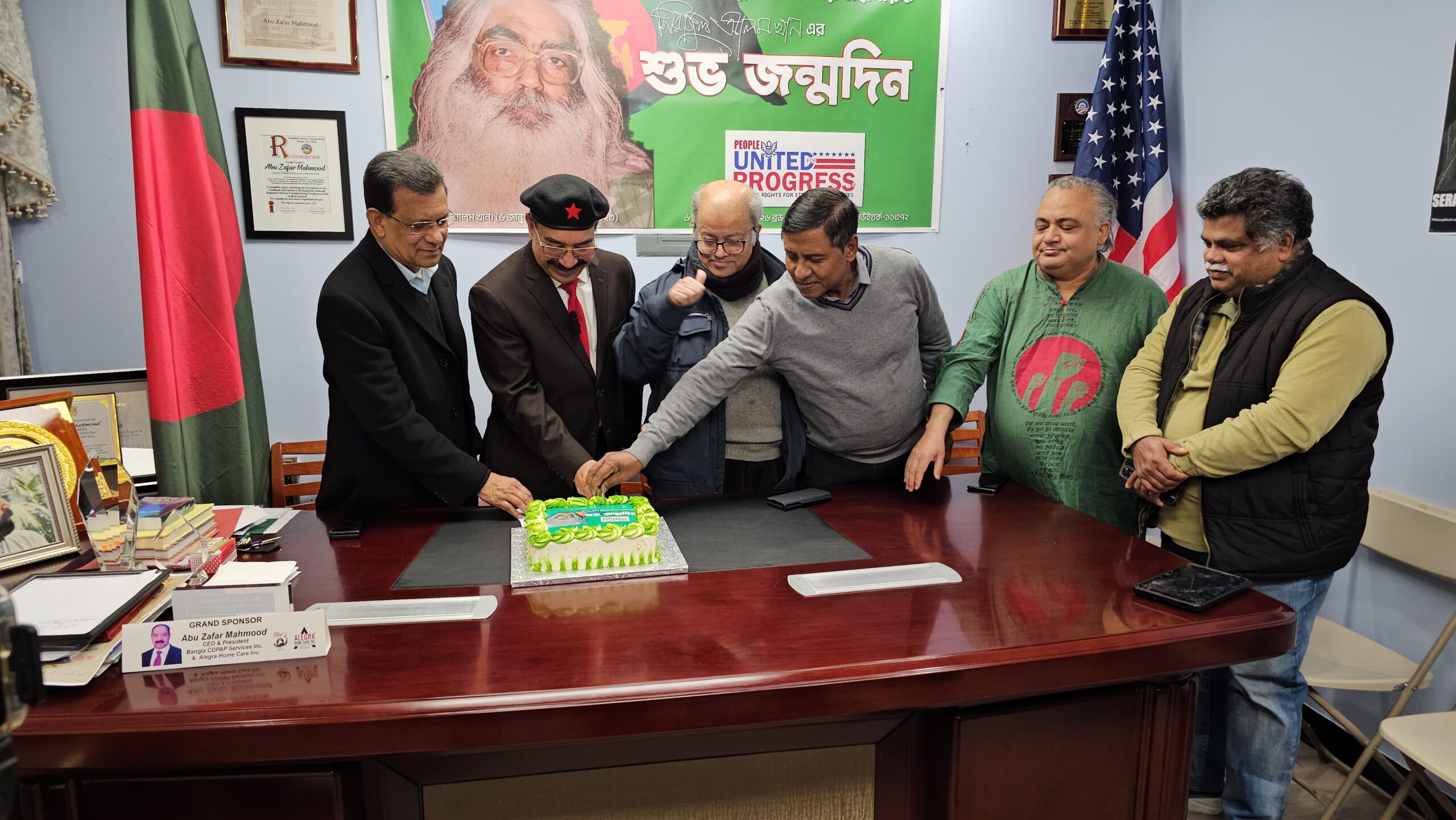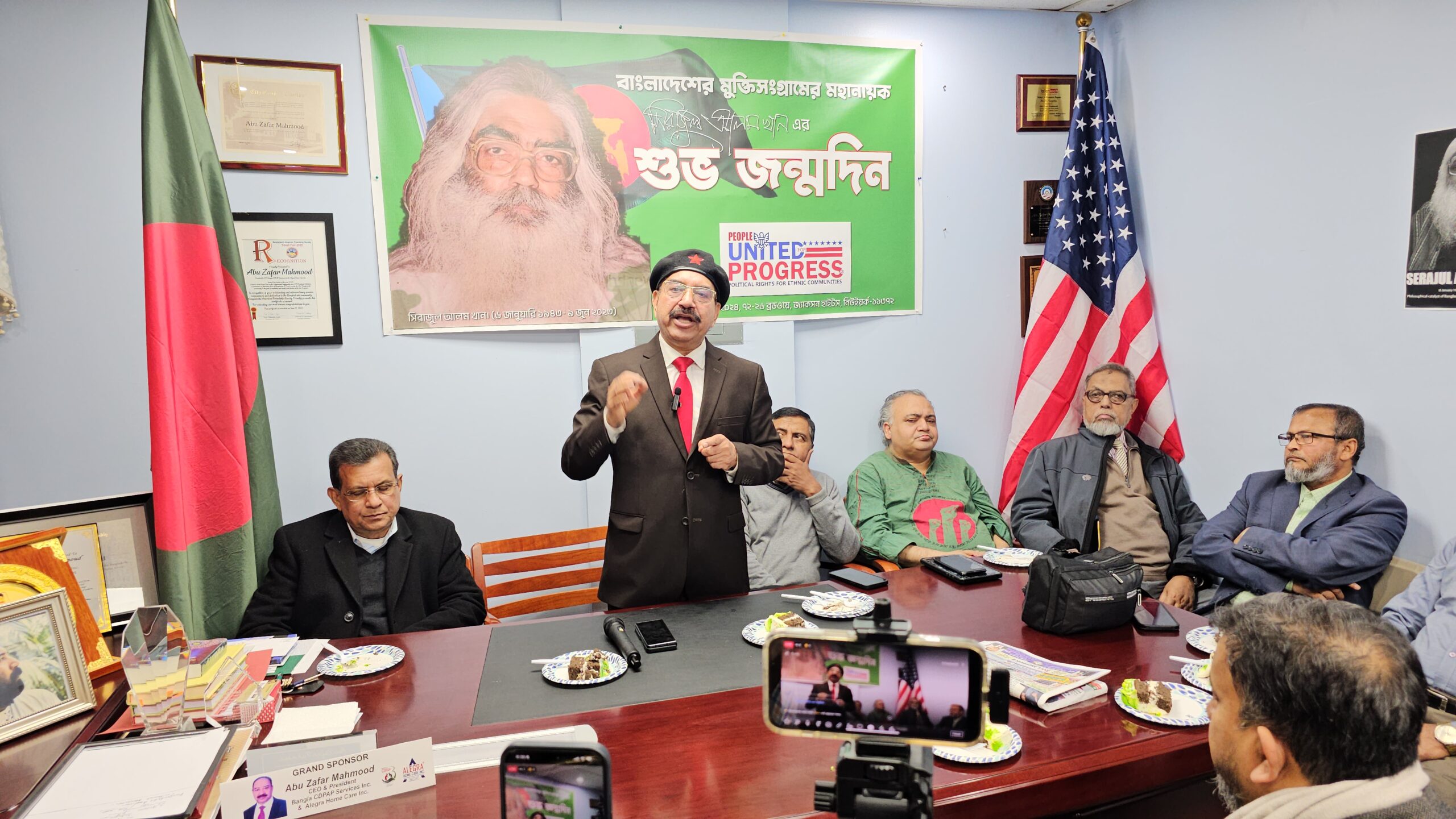 নিউইয়র্কে বাংলাদেশের মুক্তিসংগ্রামের প্রধান রূপকার সিরাজুল আলম খানের ৮৩তম জন্মদিন পালন করেছে রাজনীতি গবেষণা ও অনুশীলনের সংগঠক পিপল ইউনাইটেড ফর প্রগ্রেস, পিপল আপ। ৬ জানুয়ারি সন্ধ্যায় ষাট ও সত্তরের দশকের শীর্ষস্থানীয় ছাত্রনেতার জন্মদিন উপলক্ষে নিউইয়র্কের জ্যাকসন হাইটস-এ বাংলা সিডিপ্যাপ সার্ভিসেস ও অ্যালেগ্রা হোম কেয়ারের কর্পোরেট অফিসে ওই অনুষ্ঠানে সভাপতিত্ব করেন পিপল আপ এর প্রেসিডেন্ট, গ্লোবাল পিস অ্যামব্যাসেডর বীর মুক্তিযোদ্ধা স্যার ড. আবু জাফর মাহমুদ। অনুষ্ঠানে নিউইয়র্কের সাপ্তাহিক পরিচয় সম্পাদক নাজমুল আহসান, সাপ্তাহিক বাংলাদেশ সম্পাদক ডা. এম ওয়াজেদ, টাইম টিভি’র সিইও আবু তাহের, সিনিয়র সাংবাদিক মঈনউদ্দিন নাসের, প্রথম আলো সম্পাদক ইব্রাহিম চৌধুরী খোকন, নিউইয়র্ক বাংলাদেশ প্রেস ক্লাবের সভাপতি মনওয়ারুল ইসলাম, সাধারণ সম্পাদক মোমিন মজুমদার, লেখক সাংবাদিক মাহবুব রহমান, হক কথা’র সম্পাদক এবিএম সালাহউদ্দিন, রাজনীতিক ও আইনজ্ঞ এড. শেখ আখতারুল ইসলাম, জাসদ নেতা ও সিরাজুল আলম খানের ¯েহভাজন হাজী আনোয়ার হোসেন লিটন, রফিকউল্লাহ, জাতীয় গণতান্ত্রিক পার্টি ইউএসএ শাখার সভাপতি রহমতউল্লাহ প্রমুখ। অনুষ্ঠান পরিচালনা করেন সাংবাদিক আদিত্য শাহীন।