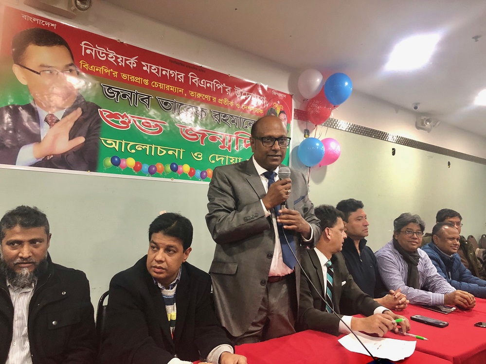 সিটির জ্যাকসন হাইটসে পালকি চায়নিজ সেন্টারে হোস্ট সংগঠনের সভাপতি হাবিবুর রহমান সেলিম রেজার সভাপতিত্বে এ অনুষ্ঠানে তারেক রহমানের সুস্বাস্থ্য এবং খালেদা জিয়ার দ্রæত আরোগ্য কামনায় বিশেষ মোনাজাত হয়। এছাড়া, জন্মদিনের কেক কাটাও হয়। অনুষ্ঠান যৌথভাবে পরিচালনা করেন সংগঠনের সেক্রেটারি আশরাফ হোসেন ও সহ-সভাপতি রেজবুল কবীর।