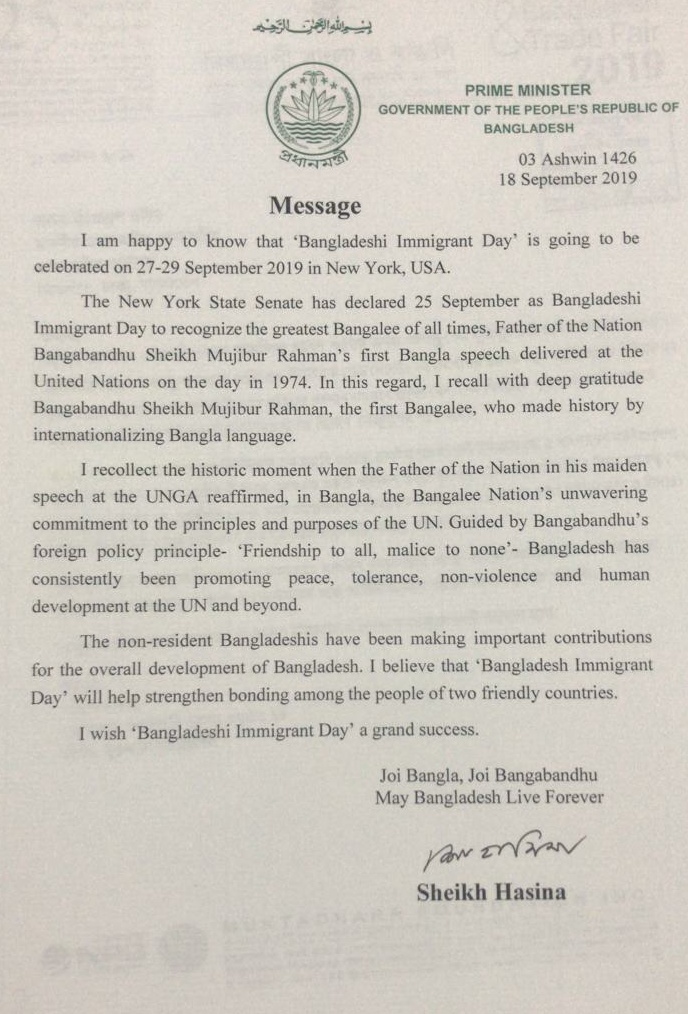 ইউএসএনিউজঅনলাইন.কম ডেস্ক, নিউইয়র্ক : নিউইয়র্ক স্টেট কর্তৃক ২৫ সেপ্টেম্বরকে বাংলাদেশী ইমিগ্রান্ট ডে ঘোষণা করা হয়েছে এবং দিনটি পালিত হয়েছে গত ৩ বছর ধরে। এ বিষয়ে বাংলাদেশের প্রধানমন্ত্রীও এ বছর একটি বাণী দিয়েছেন। মুক্তধারা ফাউন্ডেশনের
