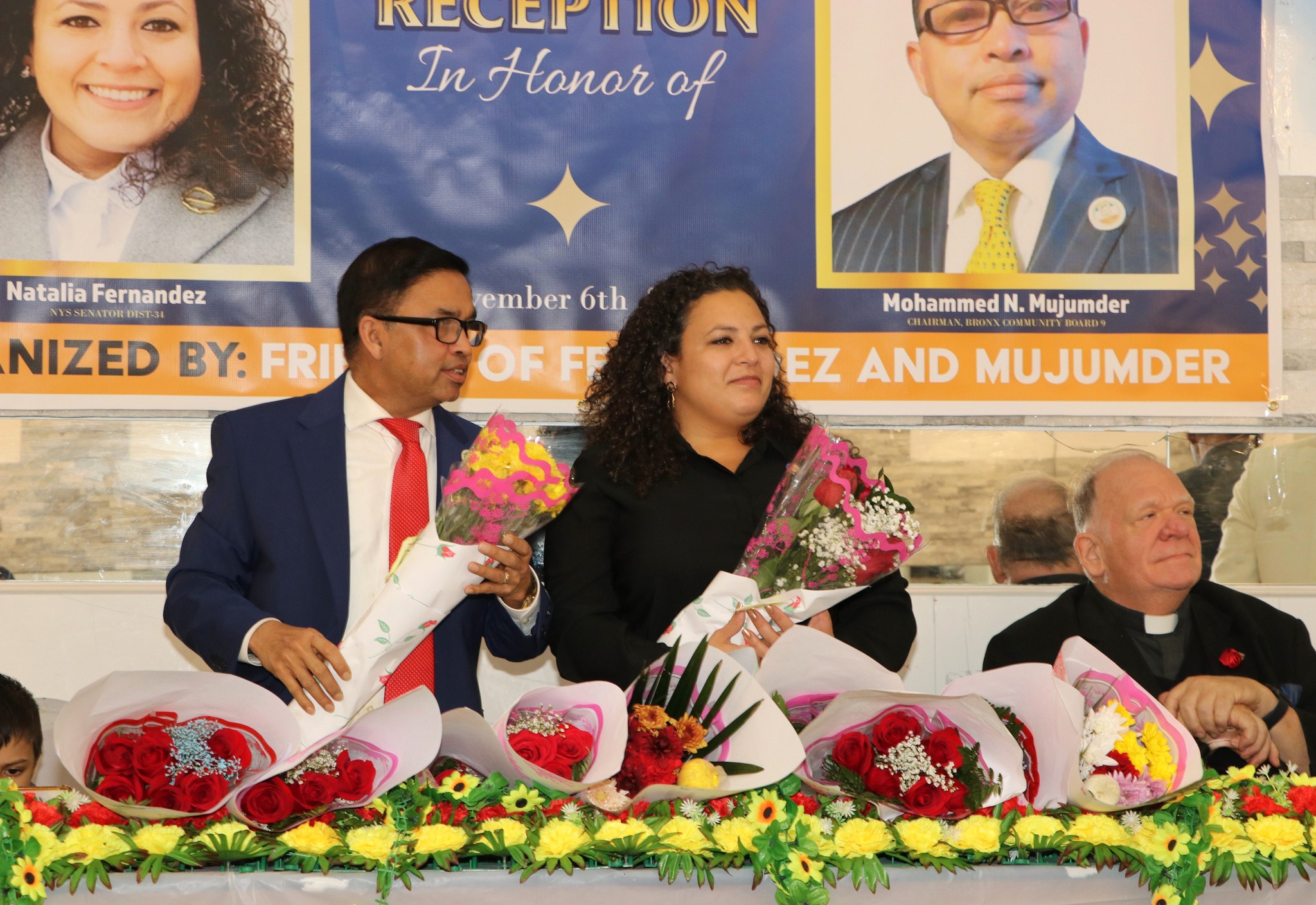 ইউএসএনিউজঅনলাইন.কম, নিউইয়র্ক : নিউইয়র্ক স্টেট সিনেটর (ডিস্ট্রিক্ট ৩৪) ন্যাথালিয়া ফার্নান্দেজ এবং ব্রঙ্কস কমিউনিটি বোর্ড ৯ এর চেয়ারম্যান মোহাম্মদ এন মজুমদারকে সংবর্ধনা প্রদান করা হয়েছে। মোহাম্মদ এন মজুমদার যুক্তরাষ্ট্রে প্রথম বাংলাদেশী আমেরিকান কমিউনিটি বোর্ড চেয়ারম্যান। গত ৬ নভেম্বর সোমবার ব্রঙ্কসের ১৪১০ ইউনিয়নপোর্ট রোডের আল আকসা পার্টি হলে ফেন্ডস অব ফার্নান্দেজ অ্যান্ড মজুমদার এ বর্ণাঢ্য সংবর্ধনার আয়োজন করে।