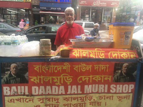 নিউইয়র্কে বাংলাদেশী অধ্যুষিত জ্যাকসন হাইটসের ৭৩ স্টিটে ব্যস্ত এলাকায় বহু বছর ধরে রাস্তার ধারে ঝালমুড়ি আর পান বিক্রি করে সবার নজর কেড়েছেন বাউল দাদা। রোদ-বৃষ্টি-শীত-বরফ উপেক্ষা করে বছরের পর বছর বাংলাদেশ প্লাজার সামনের জায়গাতে বাউল দাদার সরব অবস্থান। এই প্রবাসে তিন-চার ফুট পরিসরের এই খোলা জায়গাটিই যেন বাউল দাদার আপন আস্তানা। তবে তার এই প্রিয় স্থানটিতে সব সময় নিরাপদ-নিশ্চিন্তে থাকতে পারেনেনি তিনি। তার জন্য পোড়াতে হয়েছে অনেক কাঠ খোড়। কখনও কখনও তার ওপর নেমে এসেছে প্রশাসনের খড়গ। স্বদেশীরা তার প্রতিপক্ষ হয়েছেন কেউ কেউ। ফুটপাথ থেকে বারবার উচ্ছেদের শিকার হয়েছেন তিনি। ঝালমুড়ি ও পান বিক্রির সরঞ্জাম কেড়ে নিয়ে গেছে প্রশাসনের লোকজন। কমিউনিটি নেতৃবৃন্দ, নাগরিক অধিকার আন্দোলনের কর্মীদের সহায়তায় আবার তা ফিরেও পান তিনি। অনেক ঝড় ঝাপটা উপেক্ষা করেও এখনো ৭৩ স্ট্রিটের ওই জায়গাটুকু আঁকড়ে ধরে আছেন বাউল দাদা। দীর্ঘ সময় ধরে ৭৩ স্ট্রিটে ঝাল মুড়ি আর পান বিক্রি করছেন। এক সময়ে রেস্টুরেন্টে শেফের কাজ করেছেন। বৃদ্ধ বয়সে কেউ কাজে রাখতে চায় না। তাই বাধ্য হয়েই রোদ-বৃষ্টি-ঝড়, প্রচন্ড গরম ও ঠান্ডার মধ্যেও সপ্তাহে সাত দিন ঠায় দাঁড়িয়ে থেকে এ ব্যবসা চালিয়ে যাচ্ছেন।