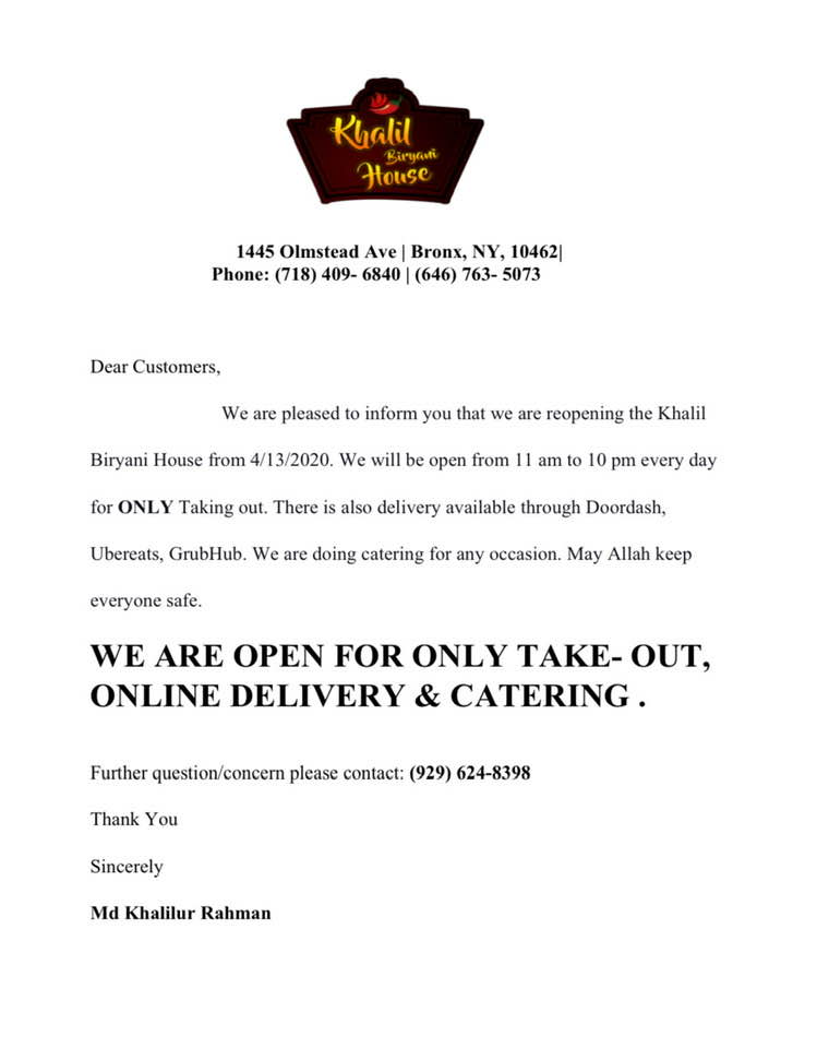 রন্ধন শিল্পী মোঃ খলিলুর রহমান জানান, নিউইয়র্কে বাঙালি অধ্যুষিত স্টারলিং-বাংলাবাজার এলাকায় একটা রেস্টুরেন্টও বর্তমানে খোলা নেই। অনেকেই বার বার কল দিয়ে জানতে চাচ্ছেন কখন খুলবো খলিল বিরিয়ানী হাউজ। তিনি বলেন, গ্রাহকদের সুবিধার কথা বিবেচনা করে খুলতে চাইলেও আমাদের স্টাফদের অনেকেই এখনো কাজ করতে আগ্রহী নয়। তবে এই দু:সময়েও দু’একজন কাজ করতে রাজী হয়েছেন। তাদের নিয়েই কস্ট হলেও আগামী সোমবার থেকে খলিল বিরিয়ানী হাউজ রেস্টুরেন্টটি চালু করবো। তিনি বলেন, আমি নিজে শেফ। তাই রান্না-বান্না করা কোন সমস্যা হবে না। আশা করি গ্রাহকদের চাহিদা অনুযায়ী প্রয়োজনীয় সেবা দিতে সক্ষম হবো।