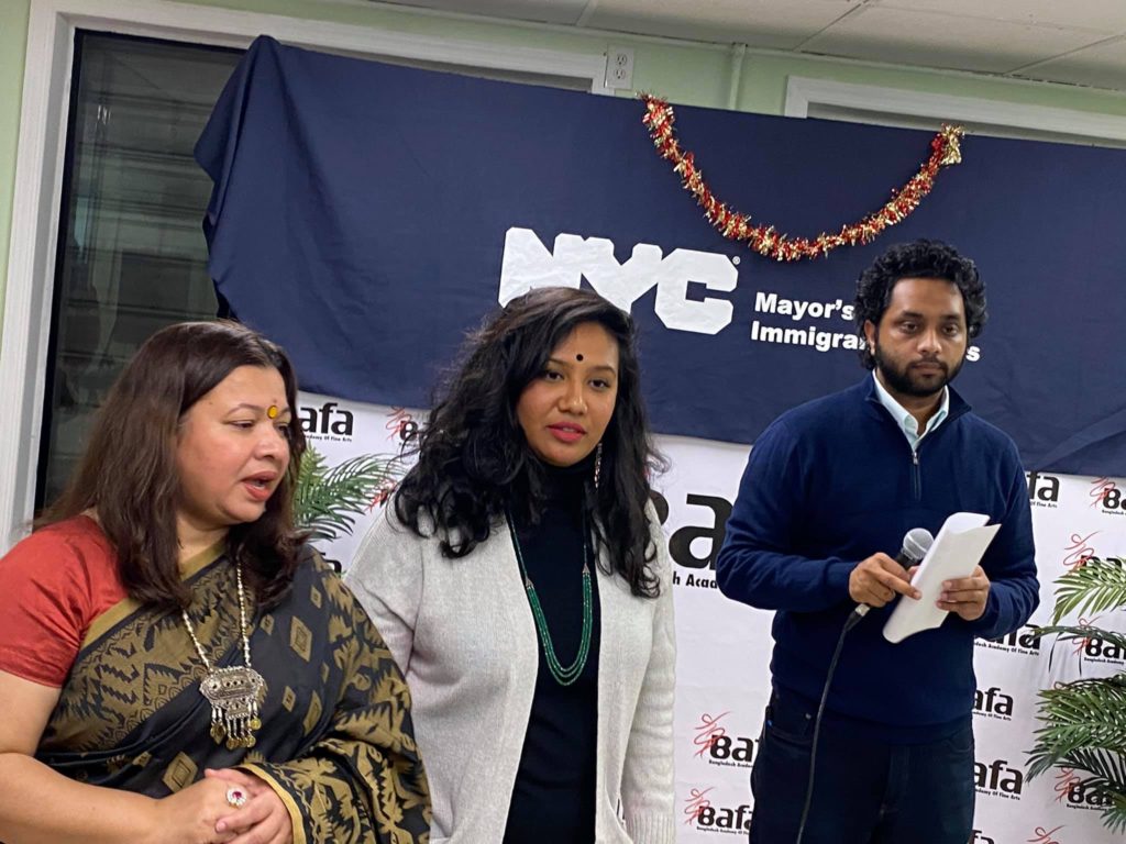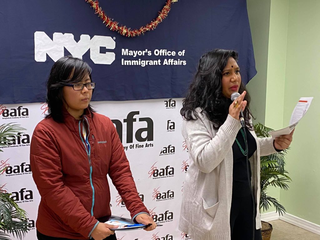 ব্রঙ্কস বাংলাদেশী ইমিগ্র্যান্ট রাইটস ফোরামের আয়োজনে এবং নিউইয়র্ক সিটি মেয়র অফিসের ইমিগ্রেন্ট এ্যাফিয়ার্স ও বাংলাদেশ একাডেমি অব ফাইন আর্ট (বাফা) এর তত্ত্বাবধানে গত ৩০ ডিসেম্বর সোমবার সন্ধ্যায় ব্রঙ্কসের স্টার্লিং এভিনিউতে বাফার কার্যালয়ে এ গুরুত্বপূর্ণ ওয়ার্কশপটি অনুষ্ঠিত হয়। ওয়ার্কশপে ইমিগ্রেশন আইন, হাউজিং, সেন্সাস সহ ইমিগ্র্যান্ট রাইটের ওপর গুরুত্বপূর্ণ ও তথ্যবহুল আলোচনা করেন বিষয়গুলো সম্পর্কে অভিজ্ঞরা। প্যানেলিস্টদের মধ্যে ছিলেন নিউইয়র্ক সিটি মেয়র অফিসের ইমিগ্রেন্ট এ্যাফিয়ার্স’র বাংলাদেশী কর্মকর্তা তাহিতুন মারিয়াম, সেতুর তীর্থ দত্ত প্রমুখ।