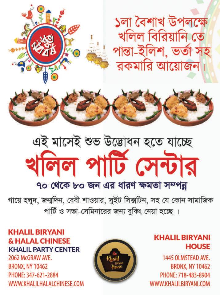খাবারের মান নিয়ন্ত্রণকারী বিশ্বখ্যাত প্রতিষ্ঠান ‘ইন্সটিউট অব কুলিনারী এডুকেশন’র সনদপ্রাপ্ত মোঃ খলিলুর রহমান ইউএসএনিউজঅনলাইন.কমকে জানান, ভিন্ন আমেজে ইফতার আয়োজন থাকবে খলিল বিরিয়ানী হাউজ ও খলিল হালাল চাইনিজে। রোজাদারদের পছন্দের রকমারি সব ইফতার সামগ্রী তৈরী করবে তারা। থাকবে ইফতারির প্যাকেজ ডিল। সুলভ মূল্যে ১০/১২টি আইটেম। ইফতার সামগ্রীর মধ্যে থাকবে ছোলা বুট, মুড়ি, চপ, বড়া, জিলেপি, দই, কাবাব, স্যুপ, শাহি হালিম, বিরিয়ানী, ভূনা খিচুড়ী ইত্যাদি। শেফ খলিলুর রহমান তার সব আয়োজনেই প্রবাসী বাংলাদেশীদের আমন্ত্রণ জানিয়েছেন। যে কোন বিষয়ে তার সাথে যোগাযোগের অনুরোধ জানিয়েছেন। ফোন: ৭১৮-৪৮৩-৮৯০৪, ৩৪৭-৬২১-২৮৮৪ এবং ৬৪৬-৭৬৩-৫০৭৩। ই-মেইল : [email protected], ওয়েব সাইট : http://www.khalilbiryani.com