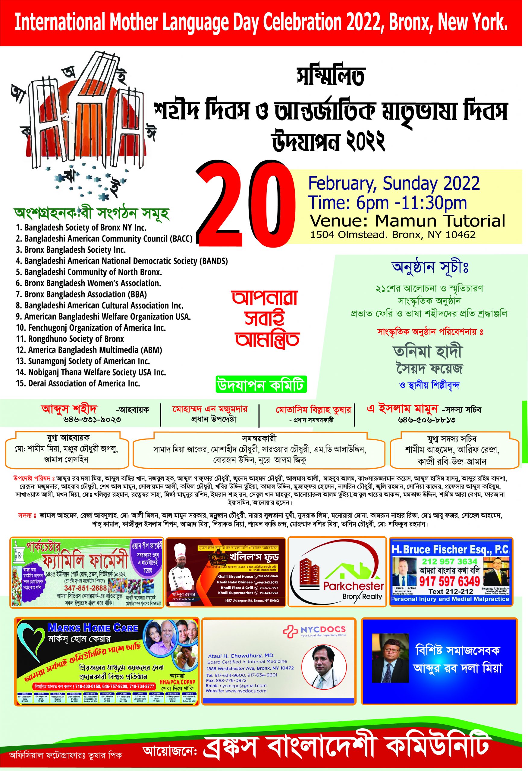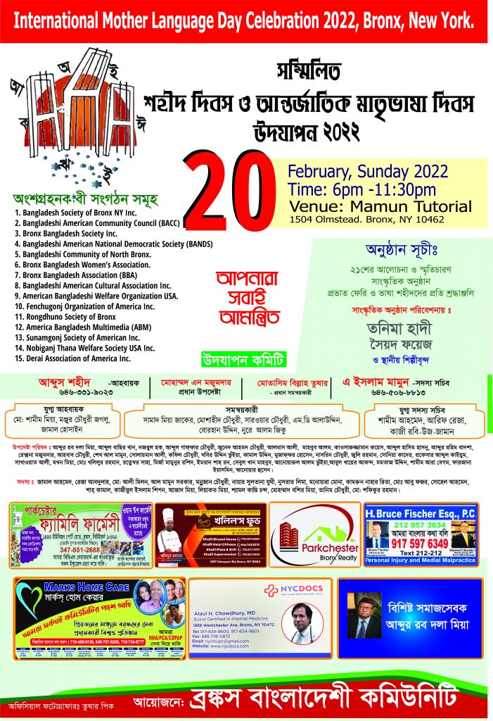 ব্রঙ্কস বাংলাদেশী কমিউনিটির পক্ষে উদযাপন কমিটির আহবায়ক আব্দুস শহীদ এবং সদস্য সচিব এ ইসলাম মামুন অনুষ্ঠানে সকলকে আমন্ত্রণ জানিয়েছেন।