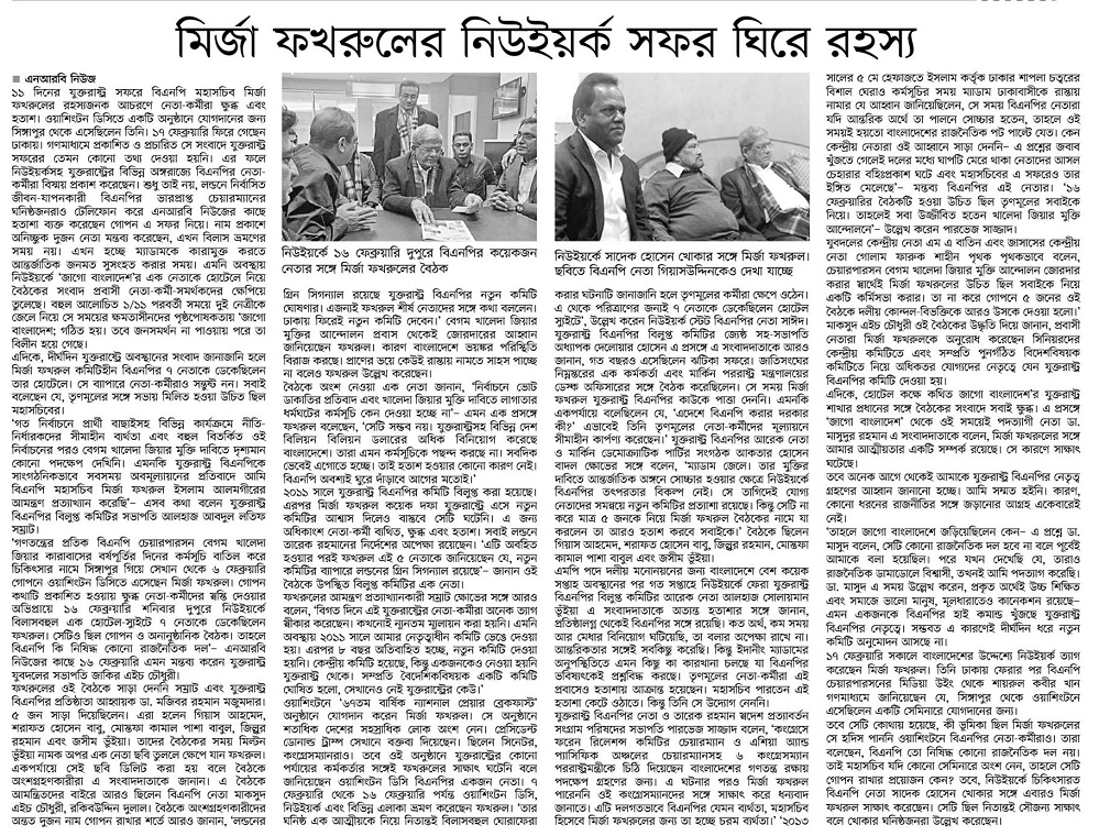 ‘গণতন্ত্রের প্রতিক বিএনপি চেয়ারপার্সন বেগম খালেদা জিয়ার কারাবাসের বর্ষপূর্তির দিনের কর্মসূচি বাতিল করে চিকিৎসার নামে সিঙ্গাপুর গিয়ে সেখান থেকে ৬ ফেব্রুয়ারি গোপনে ওয়াশিংটন ডিসিতে এসেছেন মীর্জা ফখরুল। গোপন কথাটি প্রকাশিত হওয়ায় ক্ষুব্ধ নেতা-কর্মীদের স্বস্তি দেয়ার অভিপ্রায়ে ১৬ ফেব্রুয়ারি শনিবার দুপুরে নিউইয়র্কে বিলাসবহুল এক হোটেল-স্যুইটে ৭ নেতাকে ডেকেছিলেন ফখরুল। সেটিও ছিল গোপন ও অনানুষ্ঠানিক বৈঠক। তাহলে বিএনপি কি নিষিদ্ধ কোন রাজনৈতিক দল’-এনআরবি নিউজের কাছে ১৬ ফেব্রুয়ারি এমন মন্তব্য করেন যুক্তরাষ্ট্র যুবদলের সভাপতি জাকির এইচ চৌধুরী।