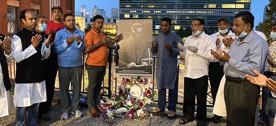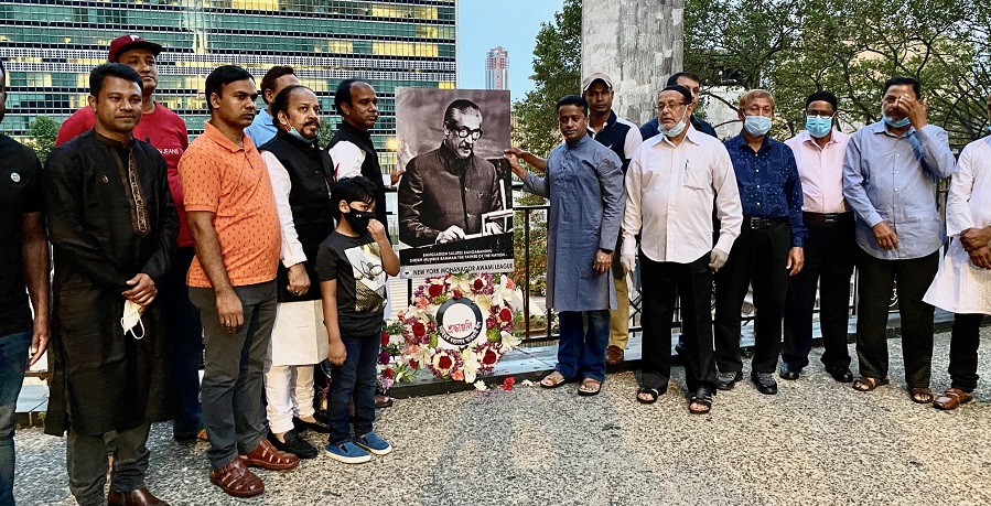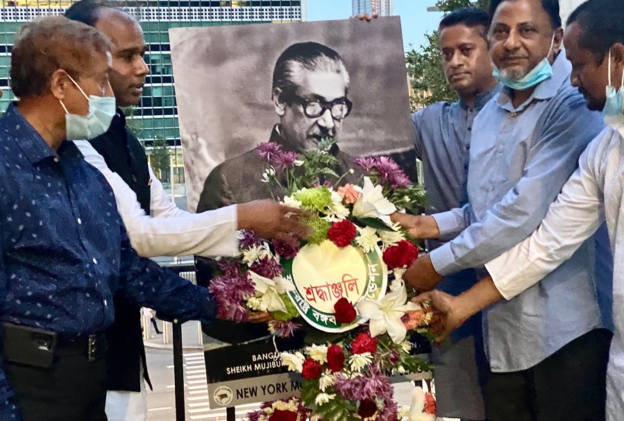 নিউইয়র্কে জাতিসংঘের সামনে বঙ্গবন্ধুর প্রতিকৃতিতে শ্রদ্ধাঞ্জলি