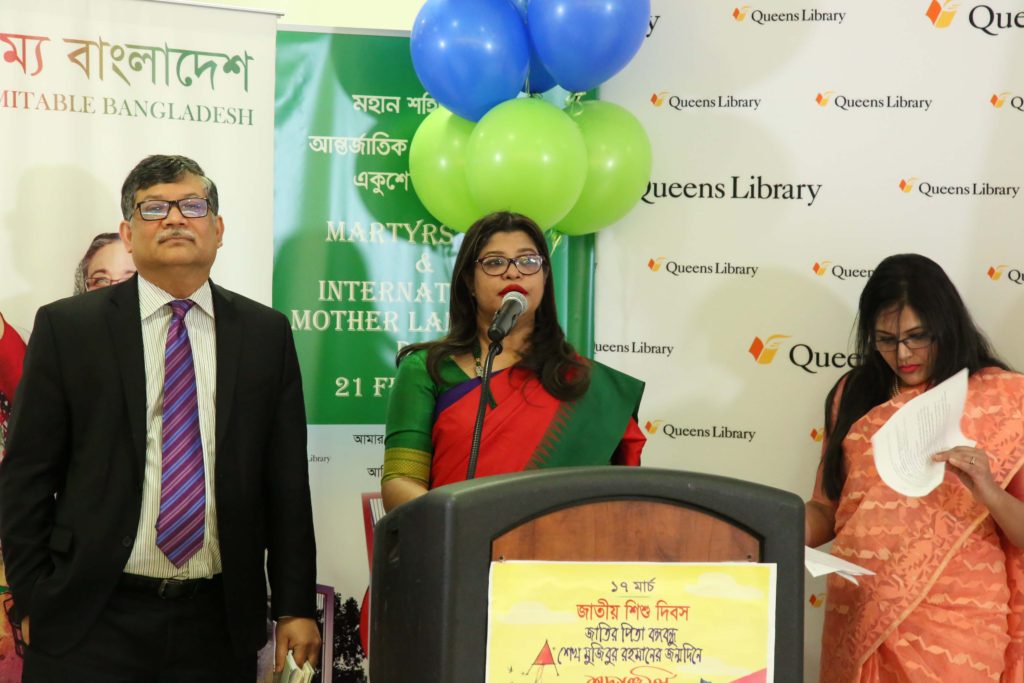 কুইন্স লাইব্রেরির প্রতিনিধি মাহেন্দ্র ইন্দ্রজিৎ বাংলাদেশ কনস্যুলেট জেনারেল ও জাতিসংঘে বাংলাদেশ স্থায়ী মিশনের সাথে যৌথভাবে কাজ করতে পেরে কুইন্স লাইব্রেরি সমৃদ্ধ হচ্ছে মর্মে অভিমত ব্যক্ত করেন। ইতোপূর্বে কুইন্স লাইব্রেরি এর ফ্লাশিং অডিটোরিয়ামে বহুভাষা ও বহুজাতিক আবহে আন্তর্জাতিক মাতৃভাষা দিবসের অনুষ্ঠান যৌথভাবে স্থায়ী মিশন ও কনস্যুলেট জেনারেলের সাথে উদযাপন করেছে মর্মে উল্লেখ করে তিনি বলেন, “বাংলাদেশের সাথে আমাদের এই সাংস্কৃতিক বিনিময় অব্যাহত থাকবে”।