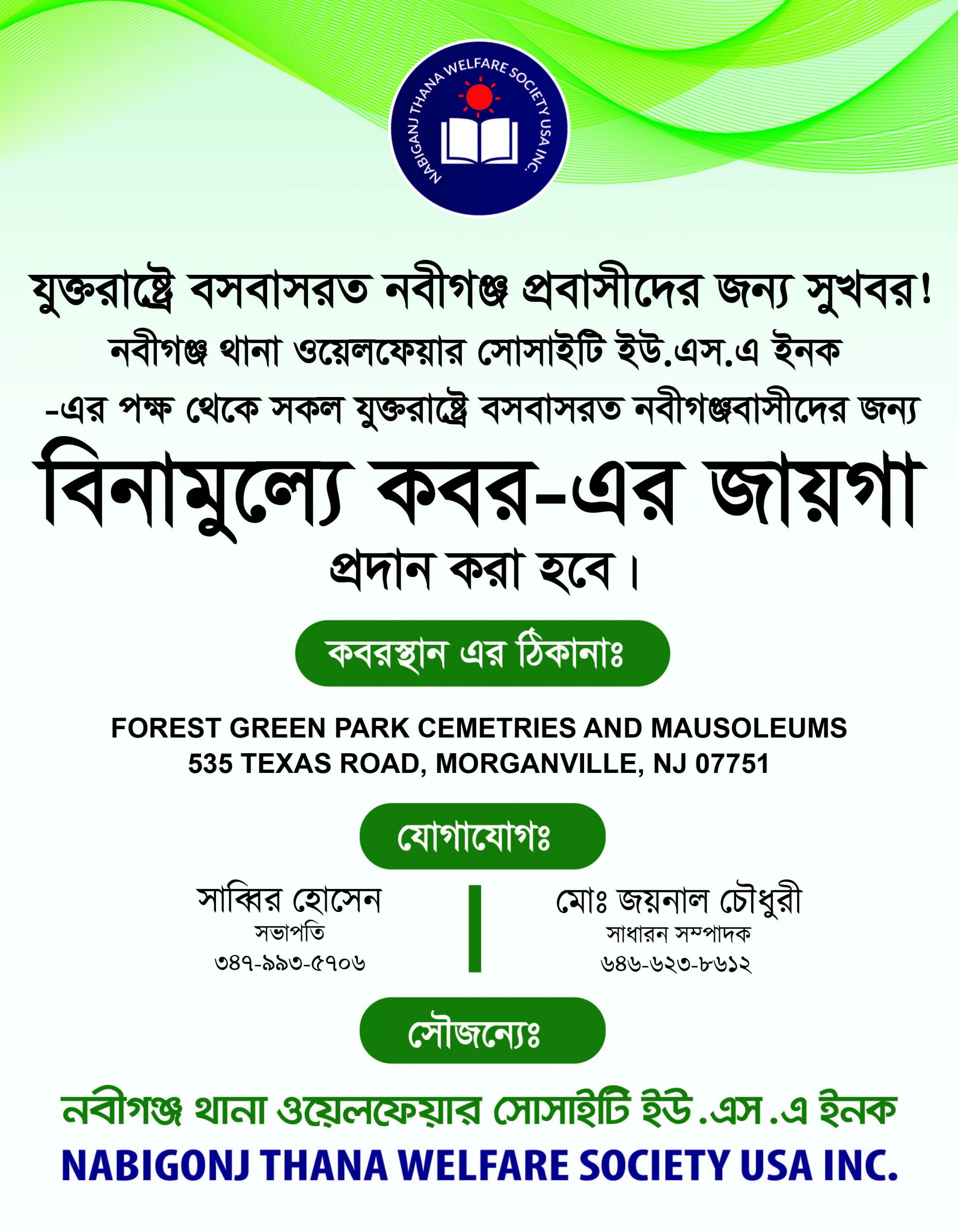 নিউইয়র্কে নবীগঞ্জ উপজেলা ওয়েলফেয়ার সোসাইটি ইউএসএ’র ফ্রি কবর স্থান প্রদানের উদ্যোগ