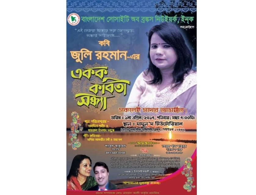 নিউইয়র্কে প্রবাসী কবি জুলি রহমানের একক কবিতা সন্ধ্যা ১ এপ্রিল