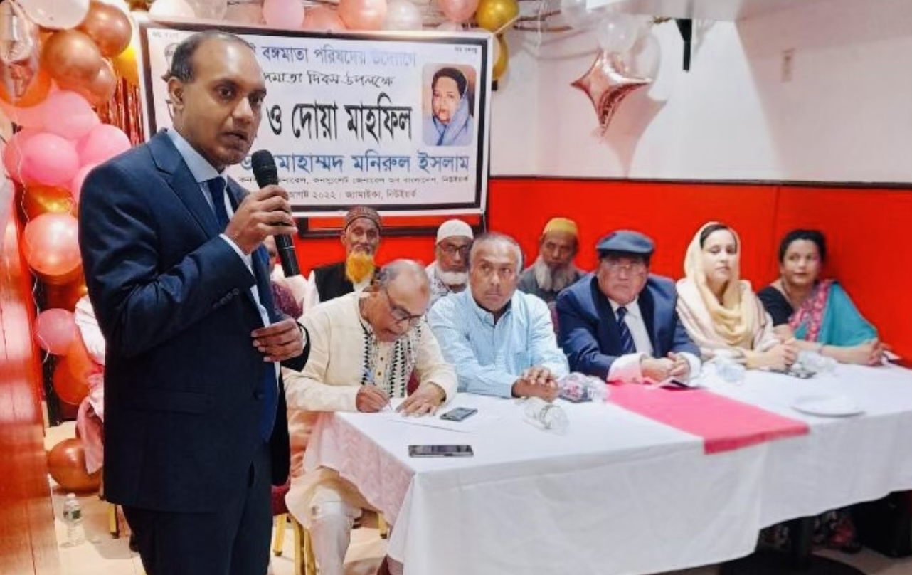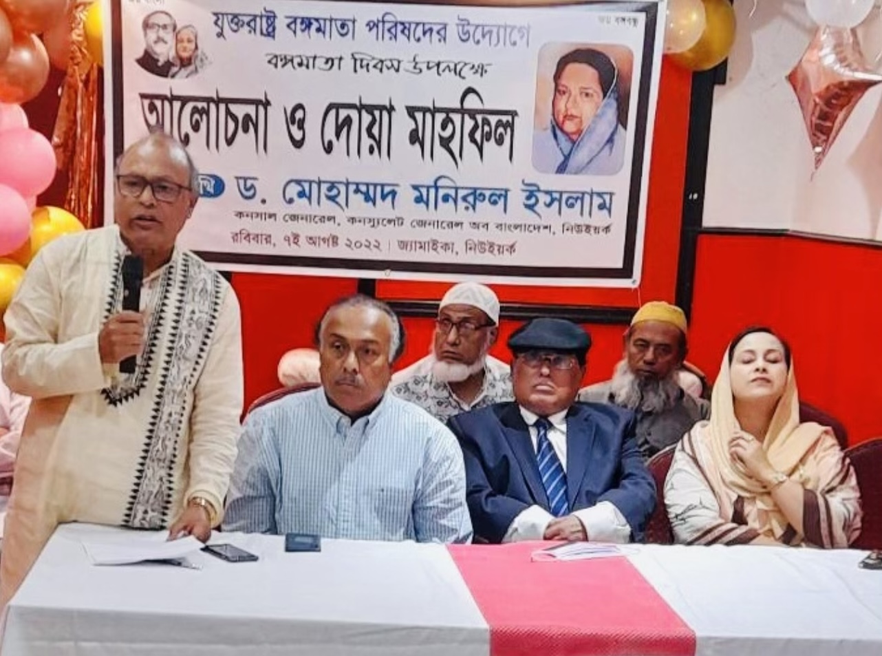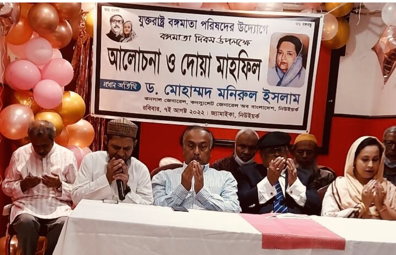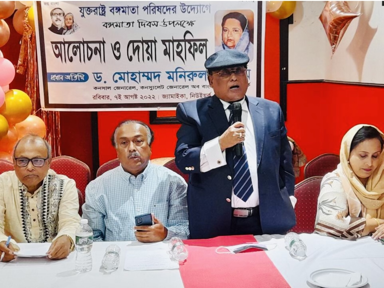বঙ্গমাতা পরিষদ যুক্তরাষ্ট্রের সভাপতি ডা: মোহাম্মদ ইনামুল হকের সভাপতিত্বে ও সাধারণ সম্পাদক সিরাজ উদ্দিন আহমদ সোহাগের পরিচালনায় অনুষ্ঠিত আলোচনা সভায় প্রধান অতিথির বক্তব্য রাখেন নিউইয়র্কে বাংলাদেশের কনসাল জেনারেল ড. মোহাম্মদ মনিরুল ইসলাম।