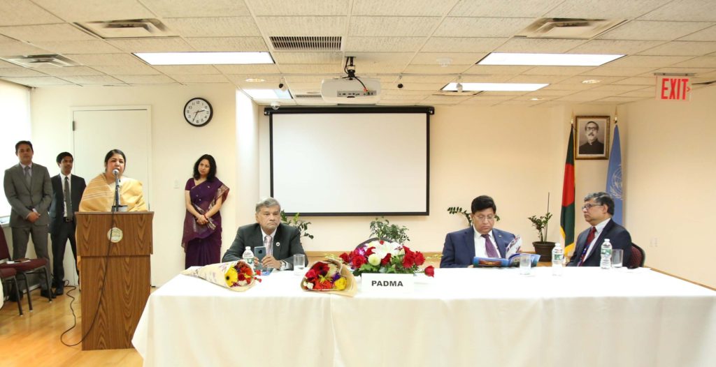 মঙ্গলবার দুপুরে জাতিসংঘের চলতি উচ্চ পর্যায়ের রাজনৈতিক ফোরামে (এইচএলপিএফ) অংশগ্রহণ উপলক্ষে নিউইয়র্ক সফররত বাংলাদেশ জাতীয় সংসদের স্পীকার ড. শিরিন শারমীন চৌধুরী এমপি, পরিকল্পনা মন্ত্রী মোহাম্মদ আব্দুল মান্নান এমপি ও যুক্তরাষ্ট্রে সরকারি সফরের অংশ হিসেবে নিউইয়র্ক সফররত পররাষ্ট্র মন্ত্রী ড. এ. কে. আব্দুল মোমেন এমপি জাতিসংঘে নিযুক্ত বাংলাদেশ স্থায়ী মিশনে মিশনের কর্মকর্তাদের সাথে এক মতবিনিময় সভায় অংশগ্রহণ করেন। অনুষ্ঠানটিতে এইচএলপিএফ-এ অংশগ্রহণকারী বাংলাদেশে এসডিজি বাস্তবায়নের মুখ্য সমন্বয়কারী আবুল কালাম আজাদসহ বাংলাদেশ সরকারের সিনিয়র সচিব, সচিব ও বিভিন্ন মন্ত্রণালয়ের সংশ্লিষ্ট কর্মকর্তাগণ উপস্থিত ছিলেন।