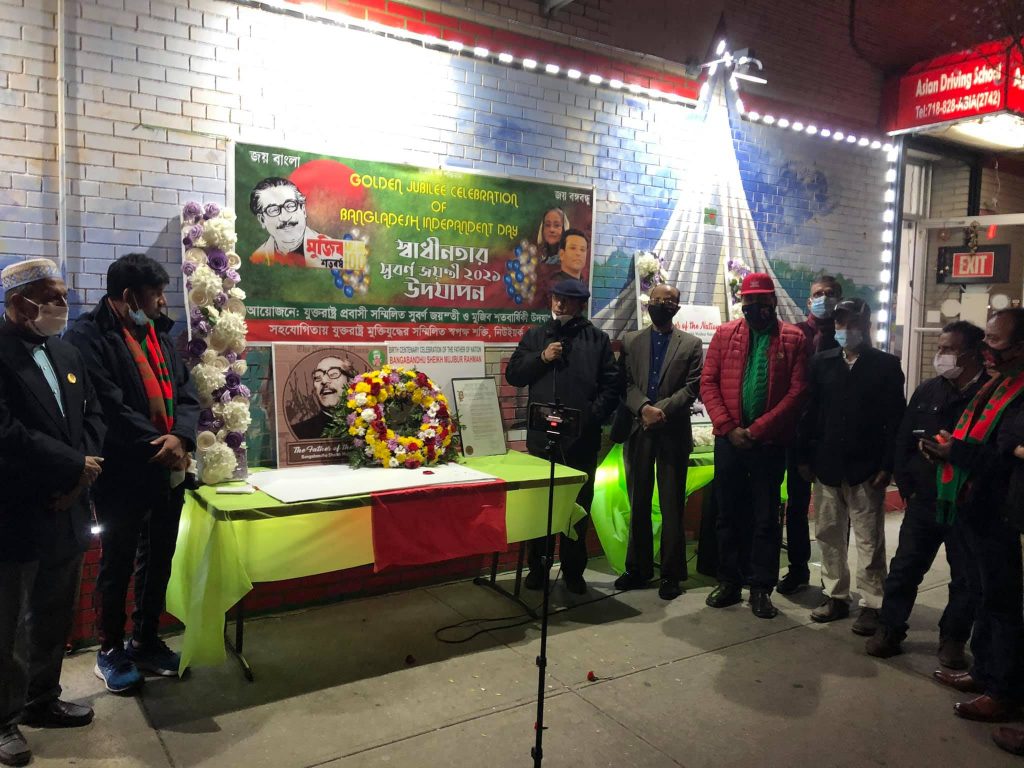 যুক্তরাষ্ট্র আওয়ামীলীগের উপদেষ্টা বীর মুক্তিযোদ্ধা তোফায়েল চৌধুরীর সভাপতিত্বে এবং হৃদয়ে বাংলাদেশ’র সাধারণ সম্পাদক পল্লব সরকারের পরিচালনায় এ আয়োজনে প্রধান বক্তা ছিলেন যুক্তরাষ্ট্র প্রবাসী সম্মিলিত সুবর্ণ জয়ন্তী ও মুজিব শতবার্ষিকী উদযাপন পরিষদের আহ্বায়ক আওয়ামীলীগ নেতা আব্দুর রহিম বাদশা। স্বাগত বক্তব্য রাখেন জন্মশতবার্ষিকী উদযাপন পরিষদের প্রধান সমন্বকারী সাইদুর রহমান লিংকন। বক্তব্য রাখেন মূলধারার রাজনীতিক আব্দুস শহীদ, উদযাপন পরিষদের মেম্বার সেক্রেটারী নূরুল ইসলাম মিলন, অনুষ্ঠান উদযাপন উপ পরিষদের সদস্য সচিব সালেহ আহমেদ, সমন্বকারী মইজুর রহমান জুয়েল, ব্রঙ্কস বাংলাদেশ এসোসিয়েশনের সাধারণ সম্পাদক কাজী রবি-উজ-জামান, বীর মুক্তিযোদ্ধা এম এ নাসির, কমিউনিটি এক্টিভিস্ট মাকসুদা আহমেদ, রুহেল চৌধুরী, সুব্রত তালুকদার, শ্যামল চন্দ প্রমুখ।
