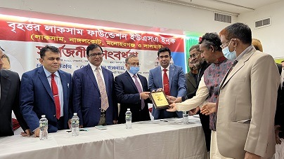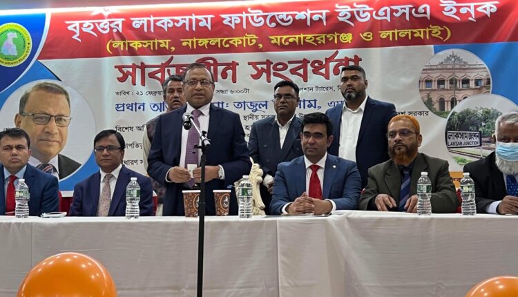 ইউএসএনিউজঅনলাইন.কম ডেস্ক, নিউইয়র্ক : বৃহত্তর লাকসাম ফাউন্ডেশনের ইউএসএ’র উদ্যোগে লাকসামের কৃতি সন্তান, বাংলাদেশ সরকারের স্থানীয় সরকার, পল্লী উন্নয়ন ও সমবায় মন্ত্রণালয়ের মন্ত্রী মো: তাজুল ইসলাম, এমপি’র নিউইয়র্কে আগমণ উপলক্ষে বর্ণাঢ্য সংবর্ধনা দিয়েছে। গত ২১ ফেব্রুয়ারি সোমবার সন্ধ্যায় এই সার্বজনীন সংবর্ধনার আয়োজন করা হয়। উডসাইডস্থ গুলশান ট্যারেসে আয়োজিত এ অনুষ্ঠানে বৃহত্তর লাকসাম ফাউন্ডেশনের সদস্য ছাড়াও প্রবাসের গণ্যমান্য ব্যক্তি, স্থানীয় রাজনৈতিক নের্তৃবৃন্দ ও মিডিয়া কর্মীরা উপস্থিত ছিলেন।
