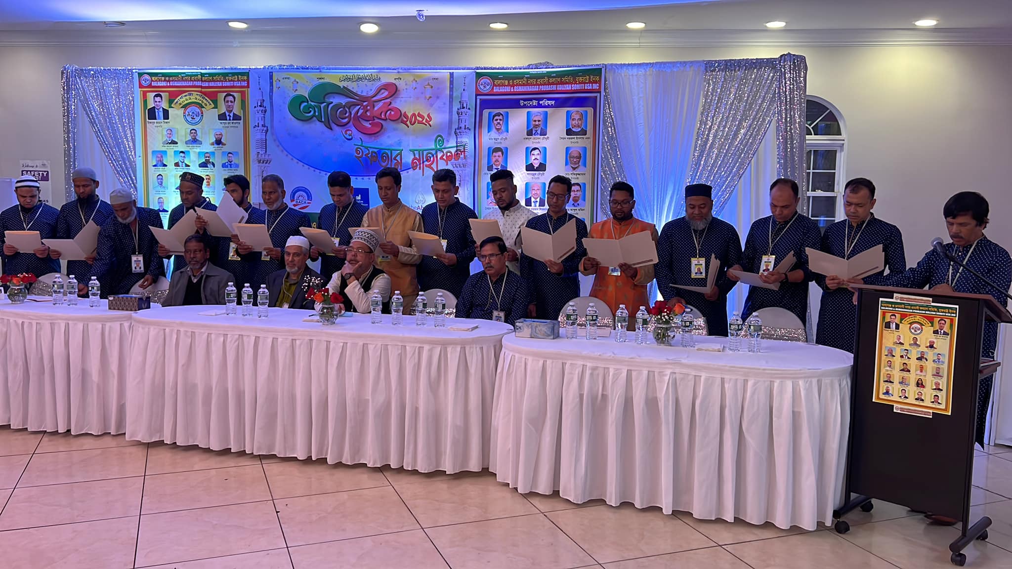 শপথ গ্রহনের পর নবনির্বাচিত সভাপতি মিজানুর রহমান মিজানের সভাপতিত্বে এবং নবনির্বাচিত সাধারণ সম্পাদক আব্দুর রব কাওসার ও সহ সাধারণ সম্পাদক জোহায়েব চৌধুরীর পরিচালনায় অনুষ্ঠানে বক্তব্য রাখেন ও উপস্থিত ছিলেন নিউইয়র্ক সিটির ডেপুটি মেয়র শিনা রাইট, অভিবাসী বিষয়ক কমিশনার ম্যানুয়েল কাস্ত্রো, নিউইর্ক স্টেট সিনেটর রবার্ট জ্যাকসন, সিটি কাউন্সিলের সদস্য আমান্ডা ফারিয়াস, এনওয়াইপিডি ক্যাপ্টেন খন্দকার আবদুল্লাহ, ক্যাপ্টেন করম চৌধুরী, লেফটেন্যান্ট কমান্ডার শামসুল হক, জালালাবাদ এসোসিয়েশন অব আমেরিকা’র সভাপতি ময়নুল হক চৌধুরী হেলাল, সাবেক উপদেষ্টা আব্দুস শহীদ, সহ সভাপতি আহবাব হোসেন চৌধুরী ও মঞ্জুর হোসেন চৌধুরী, বাংলাদেশ সোইটির সাবেক সহ সাধারণ সম্পাদক সিরাজ উদ্দিন আহমেদ সোহাগ, বাংলাদেশী আমেরিকান পুলিশ অ্যাসোসিয়েশনের সার্জেন্ট এরশাদ সিদ্দিক, বিলাল উদ্দিন, পিও লিটন সরকার, কমিউনিটি বোর্ড মেম্বার এমডি আলাউদ্দিন, আমেরিকান পাকিস্তানি অ্যাডভোকেসি গ্রুপের আলী রশিদ, মুসলিম কমিউনিটি ফোরামের প্রতিষ্ঠাতা জুহাইব চৌধুরী, লাটিনা মুসলিমস প্রেসিডেন্ট তুশা দিয়াজ, নাইজেরিয়ান কমিউনিটি প্রেসিডেন্ট ড. বোলা ওমাতোশো, ব্যাঙ্কো পপুলার ভাইস প্রেসিডেন্ট খুররম খুরশীদ জুম্মাহ, আবরার মসজিদের ইমাম ইয়াসিন তৌফিক, মদিনা মসজিদের হাফিজ ইসহাক চৌধুরী, কমিউনিটি এক্টিভিস্ট মিয়া মোহাম্মদ দাউদ, সেবুল খান মাহবুব, তৌফিকুর রহমান ফারুক, নুরে আলম জিকু, মুকিত চৌধুরী, আজাদুর রহমান, নিজাম উদ্দিন প্রমুখ। ধর্মীয় উৎসবমুখর পরিবেশের এ অনুষ্ঠানে বালাগঞ্জ ও ওসমানীনগরসী ছাড়াও বাঙালী কমিউনিটির বিশিষ্ট ব্যক্তিরা উপস্থিত ছিলেন।