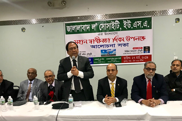 নিউইয়র্কে বাংলাদেশের স্বাধীনতা দিবস উপলক্ষে এক অনুষ্ঠানে প্রধান অতিথির বক্তব্যে তিনি এসব কথা বলেন। গত বুধবার (২৭ মার্চ) রাতে নিউইয়র্ক সিটির জ্যাকসন হাইটসে পালকি পার্টি সেন্টারের এ অনুষ্ঠানের আয়োজন করে যুক্তরাষ্ট্রস্থ ‘জালালাবাদঞ্চল সোসাইটি। অনুষ্ঠানের সভাপতিত্ব করেন সংগঠনের সভাপতি এডভোকেট এমাদ উদ্দিন। সম্মানীত অতিথি ছিলেন ইউএস সুপ্রিম কোর্টের আইনজীবী এবং কুইন্স ডিস্ট্রিক্ট ডেমক্র্যাটিক পার্টির লিডার এটর্নী মঈন চৌধুরী। অতিথি হিসেবে আরো বক্তব্য রাখেন এডভোকেট আব্দুল মালেক, মুক্তিযোদ্ধা শেখ আক্তারুল ইসলাম, আন্তর্জাতিক যুদ্ধাপরাধ ট্রাইব্যুনালের প্রসিকিউশন টিমের অন্যতম সদস্য ব্যারিস্টার সৈয়দ সাঈদুল হক সুমন, এডভোকেট ইব্রাহিম চৌধুরী খোকন প্রমুখ। হোস্ট সংগঠনের সেক্রেটারি এডভোকেট সুফিয়ান আহমেদ চৌধুরী অনুষ্ঠানের সঞ্চালনার সময় দেশপ্রেমে উজ্জীবিত নিজের লেখা কয়েকটি ছড়া পাঠ করেন।
