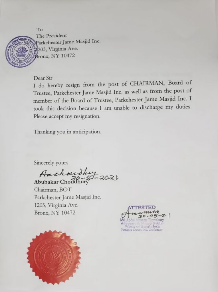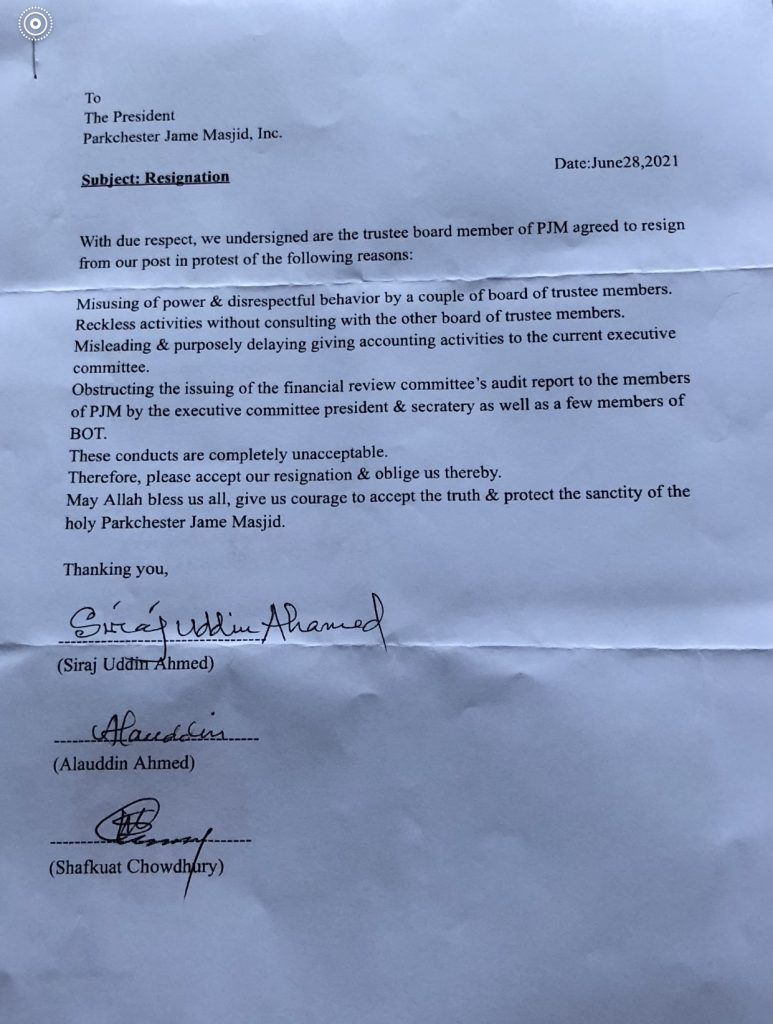 নিউইয়র্কে ব্রঙ্কসের পার্কচেষ্টার মসজিদের ট্রাস্টি বোর্ডের চেয়ারম্যান সহ ৪ সদস্যদের পদত্যাগ