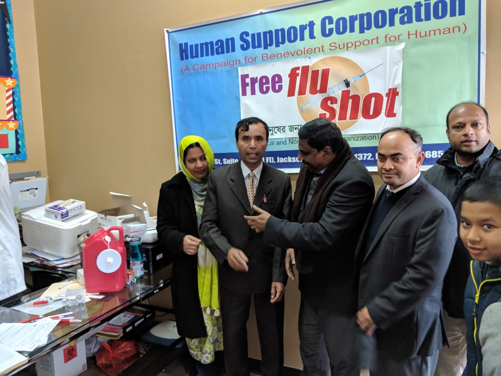 মোঃ সোলায়মান আলী। এসময় বাংলাদেশী আমেরিকান ন্যাশনাল ডেমোক্রটিক সোসাইটি ইউএসএ ইনক সাধারণ সম্পাদক শামীম মিয়া, সহ সভাপতি কফিল উদ্দিন চৌধুরী ও  সংগঠনের ভারপ্রাপ্ত সেক্রেটারি তপন সেন, এবং ডুয়েনরিড ফার্মাসিস্ট ও ম্যানেজার মি: নীক কৌটোভাস, যুক্তরাষ্ট্র মহিলা আওয়ামী লীগের সহ-সভাপতি জাহানারা আলী, ডা: ফয়সাল আহমেদ প্রমুখ। ধারাবাহিক ভাবে প্রতি বছরের ন্যায় এবারও “মানুষ মানুষের জন্য” শ্লোগানে উদ্বুদ্ধ হয়ে ক্রমবর্ধমান কমিউনিটিতে ইনফ্লুয়েঞ্জা ভাইরাসের হাত থেকে রক্ষা পেতে স্বাস্থ্য সচেতনতা বৃদ্ধির  লক্ষ্যে প্রতিকী হিসেবে এই কর্মসূচি পালন করা হয়। প্রতি বছর উঃ আমেরিকায় ফ্লু-তে আক্রান্ত হয়ে হাজারের অধিক লোক মারা যায়। হিউম্যান সাপোর্ট কর্পোরেশন প্রায় ছয় বছর পর্যায়ক্রমে কমিউনিটির সেবায় এই কর্মসূচি পালন করে আসছে।