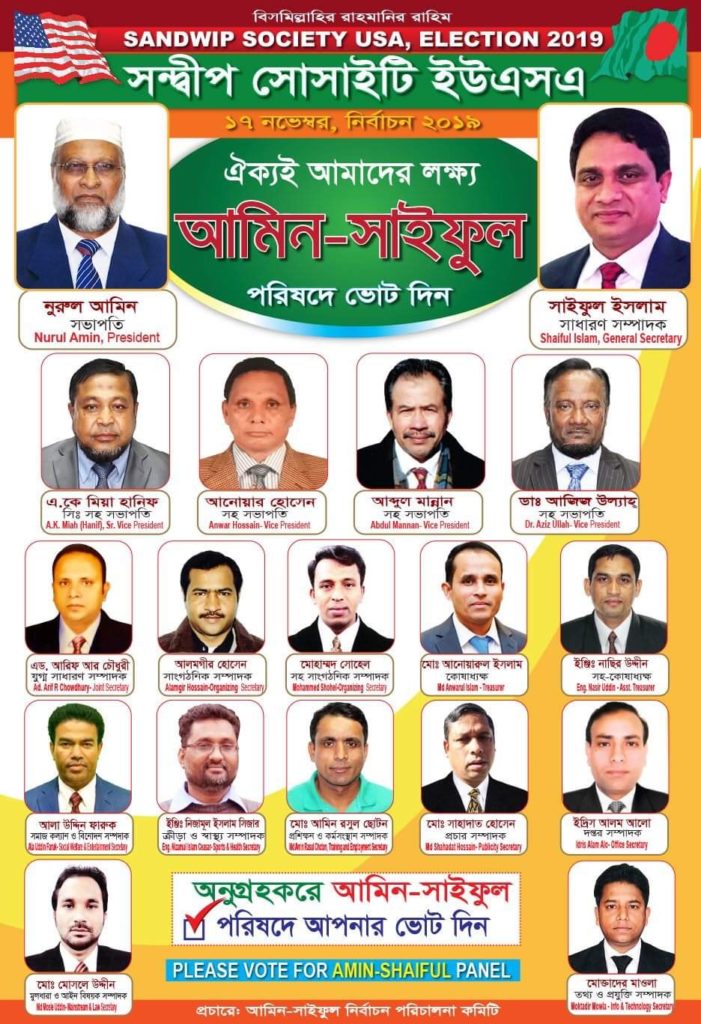 এ নির্বাচনে সভাপতি প্রার্থী নুরুল আমিন এবং সাধারণ সম্পাদক প্রার্থী সাইফুল ইসলামের নেতৃত্বাধীন আমিন-সাইফুল পরিষদ ঐক্যের লক্ষ্যে সন্দ্বীপবাসীর দো’য়া ও সহযোগিতা কামনা করেছেন। গত ৩১ অক্টোবর ব্রুকলীনে নির্বাচনে অন্যতম প্রতিদ্বন্দ্বিতাকারী আমিন-সাইফুল প্যানেলের নির্বাচনী সভা ও সংবাদ সম্মেলন অনুষ্ঠিত হয়। প্রবীণ প্রবাসী ও সন্দ্বীপ এসোসিয়েশনের সাবেক সভাপতি মো: শহীদুল্লাহর সভাপতিত্বে অনুষ্ঠিত সভায় অন্যদের মধ্যে বক্তব্য রাখেন সভাপতি পদপ্রার্থী বিশিষ্ট ব্যবসায়ী, সমাজসেবক নুরুল আমিন, সাধারণ সম্পাদক পদপ্রার্থী সমাজসেবক সাইফুল ইসলাম, সহ সভাপতি পদপ্রার্থী মিয়া হানিফ প্রমুখ।