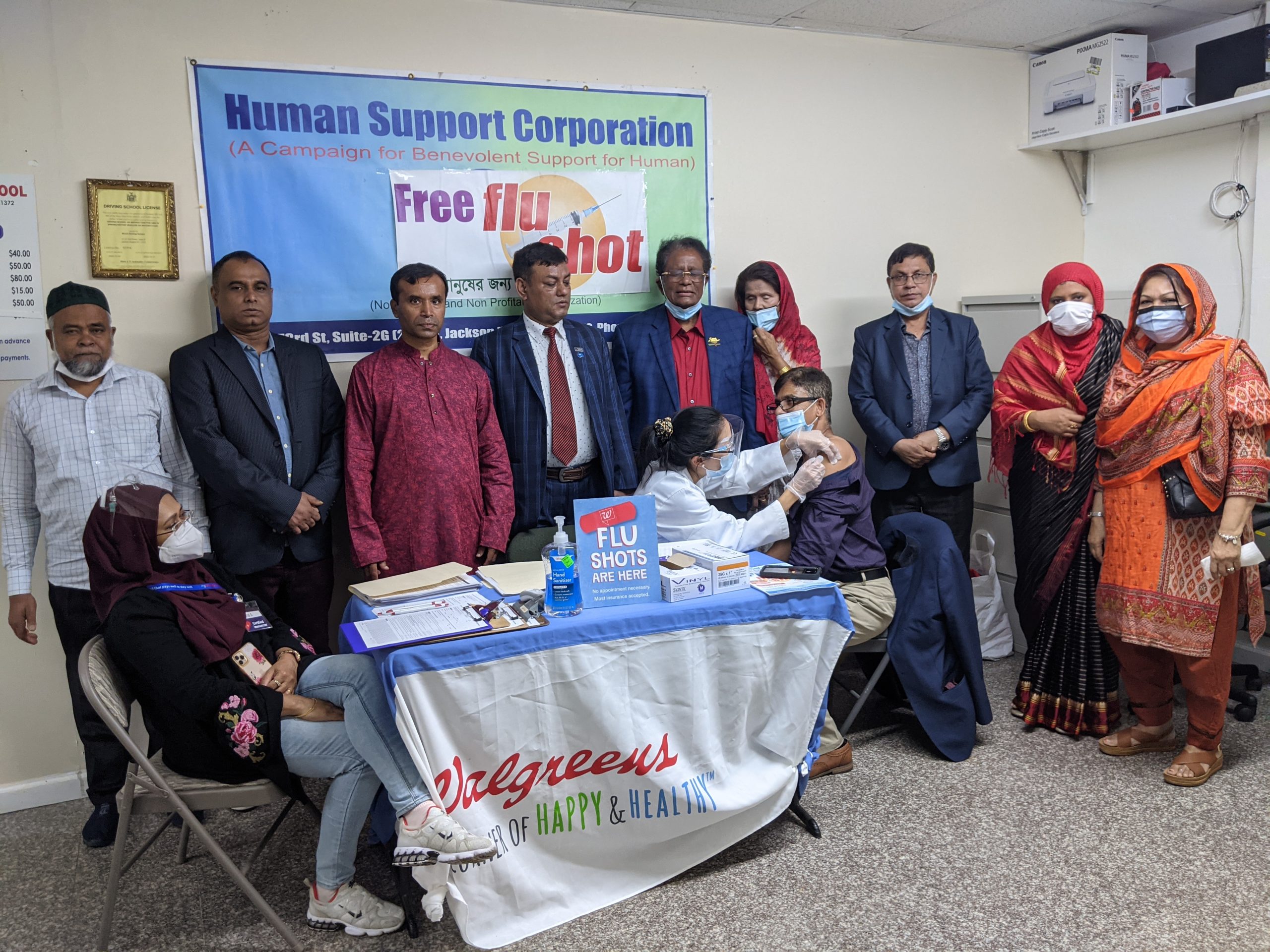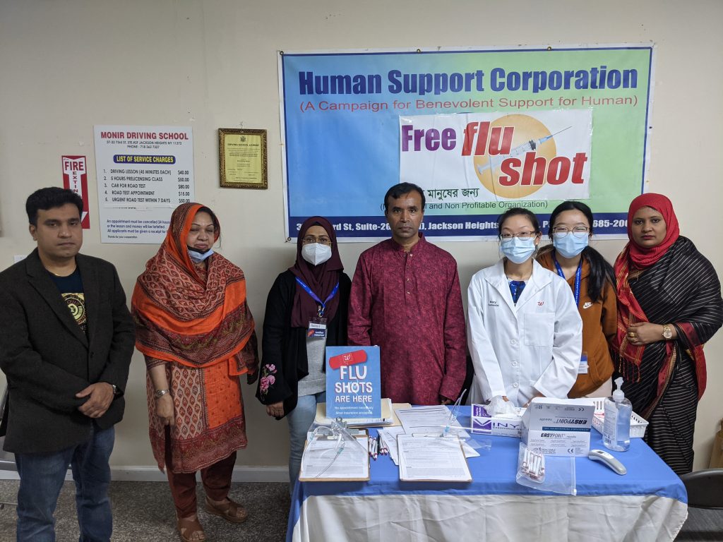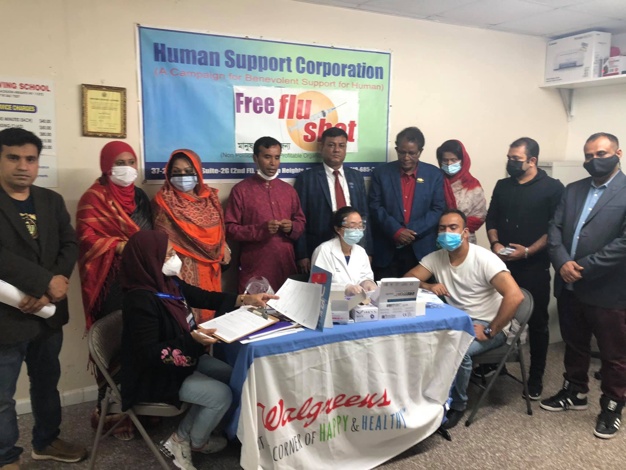 সংগঠনের সভাপতি মোঃ সোলায়মান আলী জানান, হিউম্যান সাপোর্টে কর্পোরেশনের ক্রমাগত ৯বম বর্ষের ২য় টিকাদান কর্মসূচি ফ্রী ফ্লু ভাইরাস বা ইনফ্লুয়েঞ্জা ভাইরাসের প্রতিষেধক টিকা ৩রা অক্টোবর রবিবার বিকেল ৫:৩০টা থেকে সন্ধ্যা ৮:৩০টা পর্যন্ত চলে। এই কর্মসূচি জ্যাকসন হাইটসের নবান্ন পার্টি সেন্টারের ২য় তলায় হিউম্যান সাপোর্ট কর্পোরেশনের অফিসে অনুষ্ঠিত হয়।