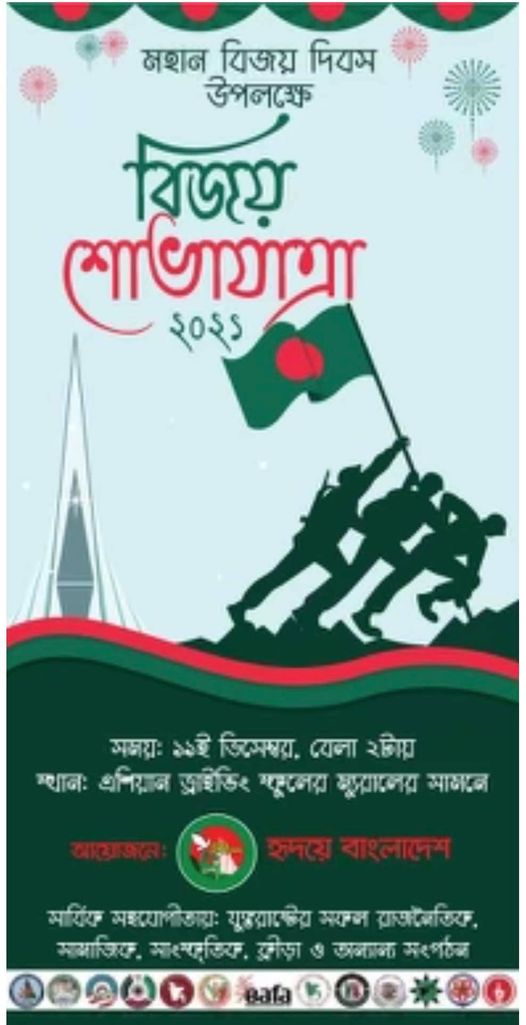 ইউএসএনিউজঅনলাইন.কম : বাংলাদেশের মহান বিজয় দিবস উদযাপন উপলক্ষে আগামী ১৯ ডিসেম্বর রোববার নিউইয়র্কে বর্ণাঢ্য বিজয় র্যালি অনুস্ঠিত হবে। হৃদয়ে বাংলাদেশ’র উদ্যোগে বিজয় র্যালি, আলোচনা সভা, মনোজ্ঞ সাংস্কৃতিক পরিবেশনা সহ নানা আয়োজনে দিবসটি উদযাপিত হবে। এদিন দুপুর ২টায় বর্ণাঢ্য আয়োজনে বিজয় শোভাযাত্রা অনুষ্ঠিত হবে। বিজয় শোভাযাত্রাটি ব্রঙ্কসের স্টারলিং-বাংলাবাজার এলাকার এশিয়ান ড্রাইভিং স্কুলের ম্যুরালের সামনে থেকে শুরু হয়ে বিভিন্ন সড়ক প্রদক্ষিণ শেষে একই স্থানে এসে শেষ হবে। এশিয়ান ড্রাইভিং স্কুল ম্যুরালের সামনেই অনুষ্ঠিত হবে মনোজ্ঞ সাংস্কৃতিক পরিবেশনা। প্রবাসের জনপ্রিয় শিল্পীরা এতে সঙ্গীত পরিবেশন করবেন। খবর ইউএসএনিউজঅনলাইন’র।