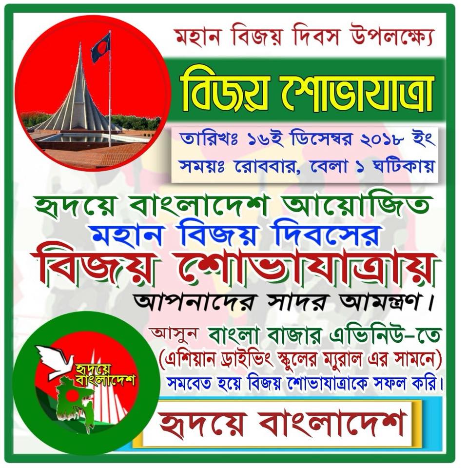 ইউএসএনিউজঅনলাইন.কম : নিউইয়র্কে সামাজিক সংগঠন হৃদয়ে বাংলাদেশ’র বিজয় র‌্যালি ও মনোজ্ঞ সাংস্কৃতিক পরিবেশনা অনুষ্ঠিত হবে আগামী ১৬ ডিসেম্বর রোববার। বাংলাদেশের মহান বিজয় দিবস উদযাপন উপলক্ষ্যে এদিন দুপুর ১টায় বিজয় শোভাযাত্রাটি ব্রঙ্কসের স্টারলিং-বাংলাবাজার-ওলমস্টেড এভিনিউর এশিয়ান ড্রাইভিং স্কুল-তানিয়া বিউটি সেলুনের দেয়ালে অঙ্কিত বাংলাদেশের শহীদ মিনার ও জাতীয় স্মুতিসৌধের বিশাল প্রতিকৃতির সামনে থেকে শুরু হয়ে বিভিন্ন সড়ক প্রদক্ষিণ শেষে একই স্থানে এসে শেষ হবে। এশিয়ান ড্রাইভিং স্কুল ম্যুরালের সামনেই অনুষ্ঠিত হবে মনোজ্ঞ সাংস্কৃতিক পরিবেশনা। প্রবাসের জনপ্রিয় শিল্পীরা এতে সঙ্গীত পরিবেশন করবেন।