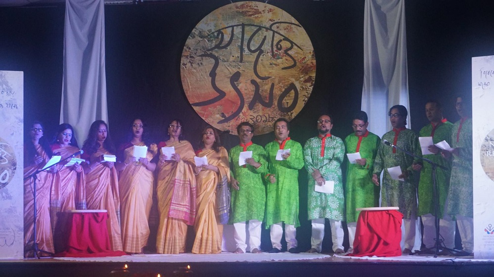 বাঙালীর কৃষ্টির যে ধারাবাহিক ঐতিহ্য রয়েছে কোন কিছুর সূচনায়,কোন কিছুর উদ্বোধনে,কোন কিছু শুরু করতে গেলে আমরা যে প্রকৃতিগত বা সাংস্কৃতিক ধারায় কোনো কিছুকে সামনে রাখি,সেই পরম্পরায় আমরা দেখেছি কোনো উৎসব করতে গেলে,পাবন করতে গেলে আমরা মঙ্গল প্রদীপ সামনে রাখি,এই উৎসবেও তার ব্যতিক্রম হয়নি সবাই খালি পায়ে মঙ্গল প্রদীপের সামনে,চারপাশে গোলাপের পাপড়ি ছড়ানো ছিটানো,অনুষ্ঠানের উদ্বোধক বিশিষ্ট নাট্য ব্যক্তিত্ব,আবৃত্তিকার ড.সালেক খান মঙ্গল প্রদীপ জ্বালিয়ে অনুষ্ঠানের আনুষ্ঠানিক উদ্বোধন করেন।মুহুর্তেই প্রদীপের সাদা সুতায় লাল আভা ছড়িয়ে পড়ে।পুরো হলের সেট ডিজাইন,লাইট, লাল কাপড়ের ব্যবহার আর প্রদীপের আলোয় মনে হলো রক্তিম সূর্যের আলোর আভায় শুভময়তা ছড়িয়ে পড়েছে চারদিকে।