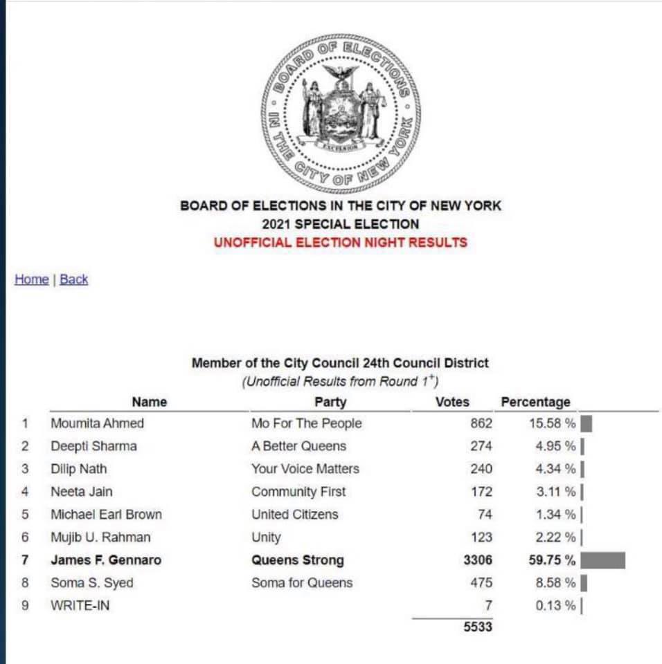 নিউইয়র্ক সিটি কাউন্সিল ডিস্ট্রিক-২৪ কুইন্স এর বিশেষ নির্বাচনে আনঅফিসিয়াল ফলাফলে জেমস এফ জেনারো নির্বাচিত