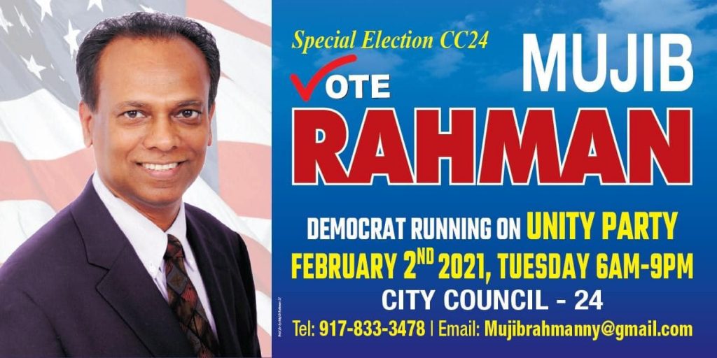 প্রকৃত বাংলাদেশী একজনকে সিটি কাউন্সিলে পাঠানো কমিউনিটির দায়িত্ব। আর তাই ২ ফেব্রুয়ারীর নির্বাচনে ব্যালটে প্রথমে তাকে চিহ্নিত করে পরবর্তী প্রার্থীদের পছন্দ করার আহ্বান জানিয়েছেন মুজিব রহমান। ২৩ জানুয়ারী থেকে ৩১ জানুয়ারী আগাম ভোটে অংশ নিতে আহ্বান জানিয়ে মুজিব বলেন, করোনাকালীন সময়ে স্বাস্থ্যবিধি মানার তাগিদে সবার উচিৎ আগাম ভোটে অংশ নেয়া। আগাম ভোট ও নির্বাচন সংক্রান্ত যেকোন বিষয়ে জানতে ৯১৭-৮৩৩-৩৪৭৮ নম্বরে যোগাযোগ করতে অনুরোধ করেছেন মুজিব রহমান। বিজ্ঞপ্তি