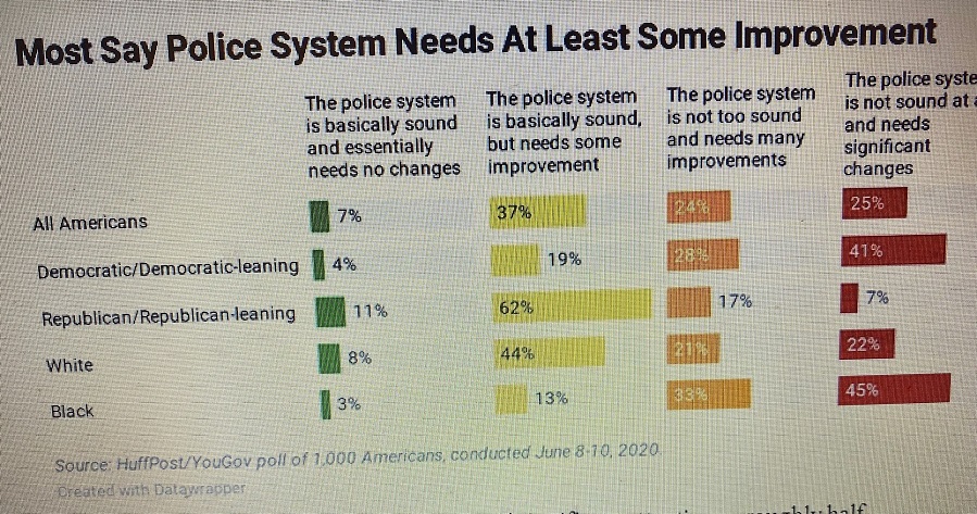 এ জরিপে অংশগ্রহণকারিগণের খুবই অল্পসংখ্যক পুলিশ বাহিনীর ফান্ড কমানোর পক্ষে মত দিয়েছেন। অধিকাংশই পুলিশ বাহিনীর পরিচালনা নীতি, প্রশিক্ষণের ধরন ঢেলে সাজাতে চেয়েছেন। অভিযুক্তদের গ্রেফতার অভিযানে অংশগ্রহণকারি সকলের বডিক্যামেরা সংযোজনের কথা বলেছেন অনেকে। অভিযুক্তদের সাথে অসদাচরণকারি পুলিশ অফিসারের বিরুদ্ধে কঠোর শাস্তির বিধি করার পরামর্শও দিয়েছেন রিপাবলিকান ও ডেমক্র্যাটিক পার্টির সমর্থকরাও। আন্দোলনের মাধ্যমে সৃষ্ট ক্ষোভের কারণে এমন কিছু করা উচিত হবে না যার ফলে সামাজিক নিরাপত্তা বিঘ্নিত হতে পাওে কিংবা পুলিশের কর্তব্যপরায়ণতায় ব্যাঘাত সৃষ্টি হতে পারে। এ জরিপে অংশগ্রহণকারিদের মাত্র ৭% বলেছেন যে, পুলিশ বাহিনী পরিচালনার বর্তমান রীতি ঠিক আছে। তারা কোন পরিবর্তনে আগ্রহী নন। আবার ৩৭% বলেছেন যে, বর্তমান রীতি ঠিক থাকলেও তা যুযোগযোগী করা দরকার বর্ণবিদ্বেষ কিংবা বর্ণ-বৈষম্যমূলক আচরণে লিপ্তদের কঠোর শাস্তির আওতায় আনা দরকার বলেও এই শ্রেণীর লোকজন মত দিয়েছেন। অপরদিকে, ৪৮% বলেছেন যে, বর্তমান রীতি কোনভাবেই গ্রহণযোগ্য নয়।